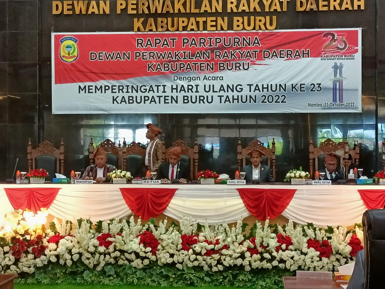 Terasnkri.com | Maluku, Namlea – Rapat Paripurna Dewan Perwakilan Rakyat DPRD Kabupaten Buru dengan Acara Memperingati Hari Ulang Tahun Ke-23 Kabupaten Buru digelar di Aula Rapat Gedung DPRD Kabupaten Buru Jln Baru Jiku Kecil, Kecamatan Namlea, Kabupaten Buru Selasa (11/10 /2022), Pkl 11.00 Wit,
