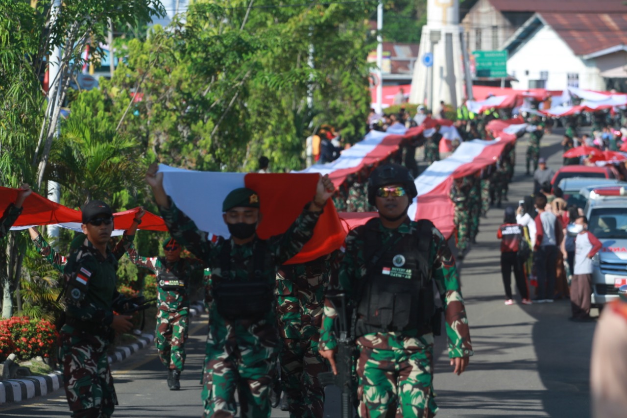 Bentangkan Merah Putih 1 Km, Satgas Pamtas Darat RI-Malaysia Yonif 621/Manuntung Meriahkan Pawai Budaya HUT Kab. Nunukan