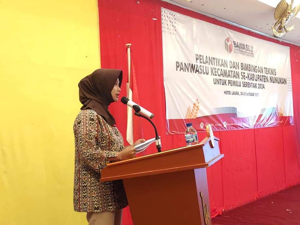 TERASNKRI.COM | NUNUKAN – Bupati Kabupaten Nunukan Hj.Asmin Laura Hafid menghadiri acara pelantikan dan bimbingan teknis pengawas pemilihan umum kecamatan, Se- Kabupaten Nunukan oleh Bawaslu Kabupaten Nunukan Tahun 2022 bertempat ruang pertemuan lt. 3 Hotel Laura, Minggu (30/10/2022).