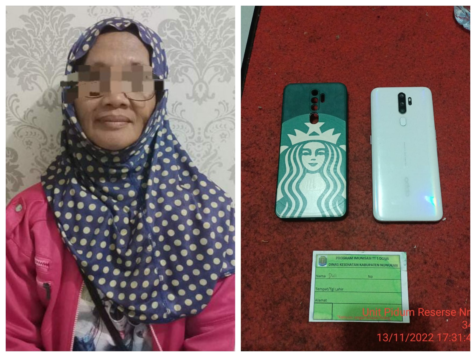 “Menindak lanjuti laporan HA, diadakan penyelidikan dan propeling terhadap dugaan pelaku, pelaku diamankan di Jl lingkar RT 17 Kel. Nunukan Timur pada saat pelaku baru pulang dari Sungai Nyamuk Pulau Sebatik, dan ditemukan HP OPPO A5, silikon dan kartu imunisasi milik HA” tambah Iptu Siswati.