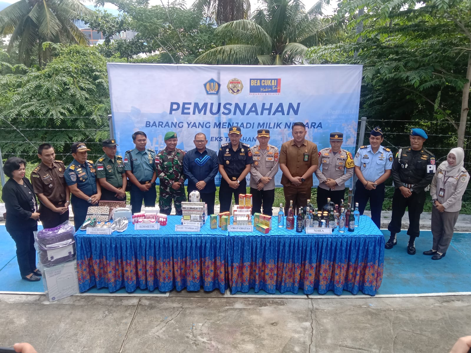 “Yang tadi dimusnahkan berupa minuman mengandung Etil Alkohol berbagai merek sebanyak 1.068 botol, 788 kaleng dan 11 jerigen. Hasil tembakau merek SP86, Luffman, Coffee stik dan berbagai merek lainya sebanyak 43.837 batang, kosmetik dengan berbagai merek yang tidak memiliki izin BPOM sebanyak 200 set dan 7.866 pcs, obat-obatan dengan berbagai merek yang tidak memiliki izin BPOM sebanyak 192 pcs, Ball press atau pakaian bekas sebanyak 48 karung, Tas, dompet, sepatu dan termos sebanyak 100 pcs,” jelas Agus.