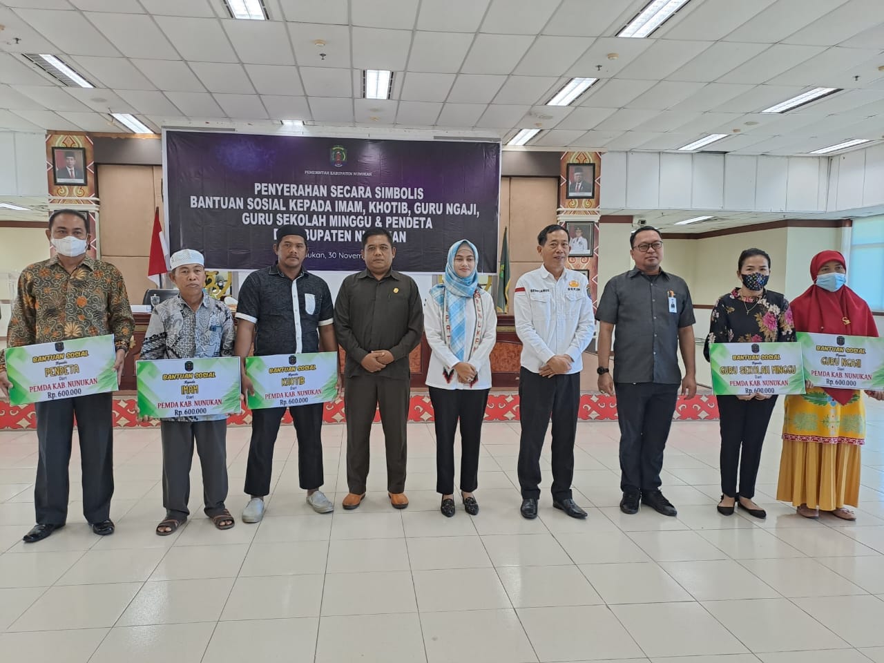 Penyerahan secara simbolis bantuan sosial untuk guru mengaji, guru sekolah minggu, imam, khotib dan pendeta merupakan bantuan yang bersumber dari APBD Kabupaten Nunukan tahun anggaran 2022 yang disalurkan langsung ke rekening Bank Kaltimtara masing-masing penerima bantuan dengan jumlah total penerima bantuan Kabupaten Nunukan sebanyak 2.394 orang yang tersebar di 21 Kecamatan. (TN/Prokompim Nnkn/Adv)