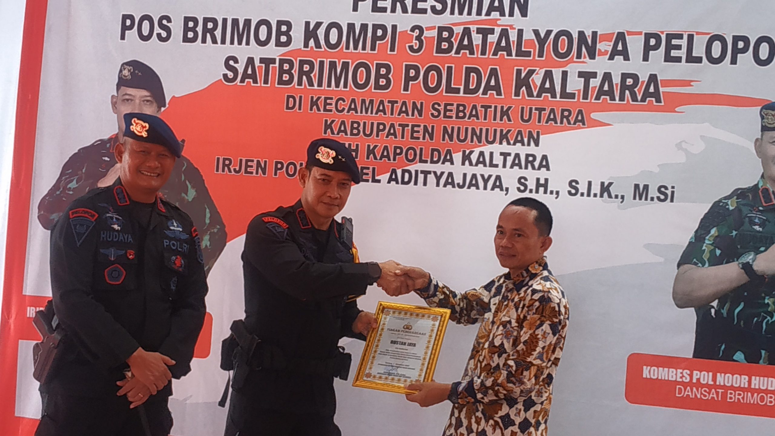 Dalam kesempatan persemian ini juga diberikan piagam penghargaan dari Kapolda Kaltara terhadap salah satu tokoh masyarakat Sebatik Rustam Jaya yang menghibahkan lahannya seluas 4,5 hektar kepada Sat Brimob Polda Kaltara. (TN/001)