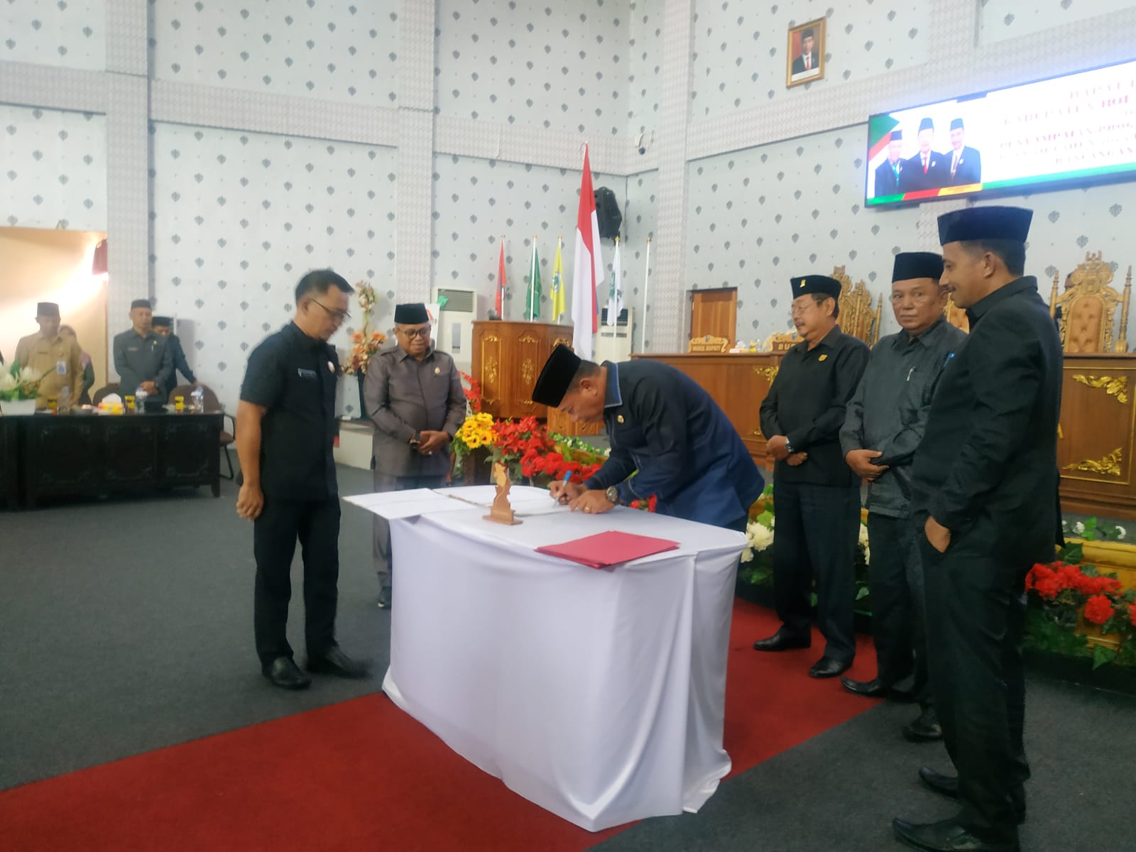 Bupati kemudian sangat bersyukur, akhirnya pada hari ini kita telah melewati sebuah proses yang panjang untuk merumuskan dan menyempurnakan lima buah Ranperda ini menjadi Peraturan Daerah (Perda).