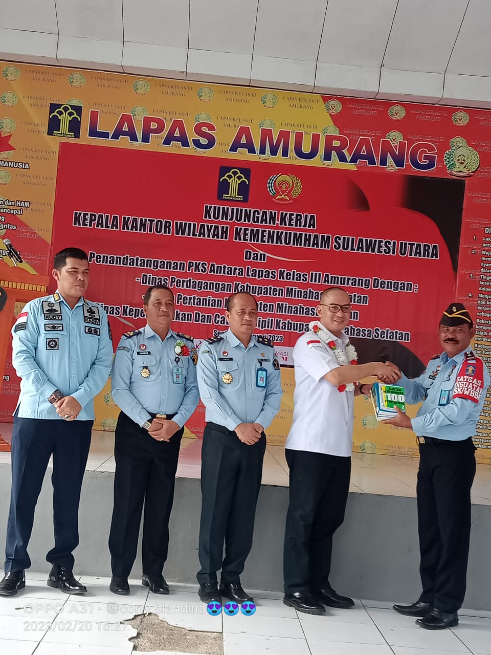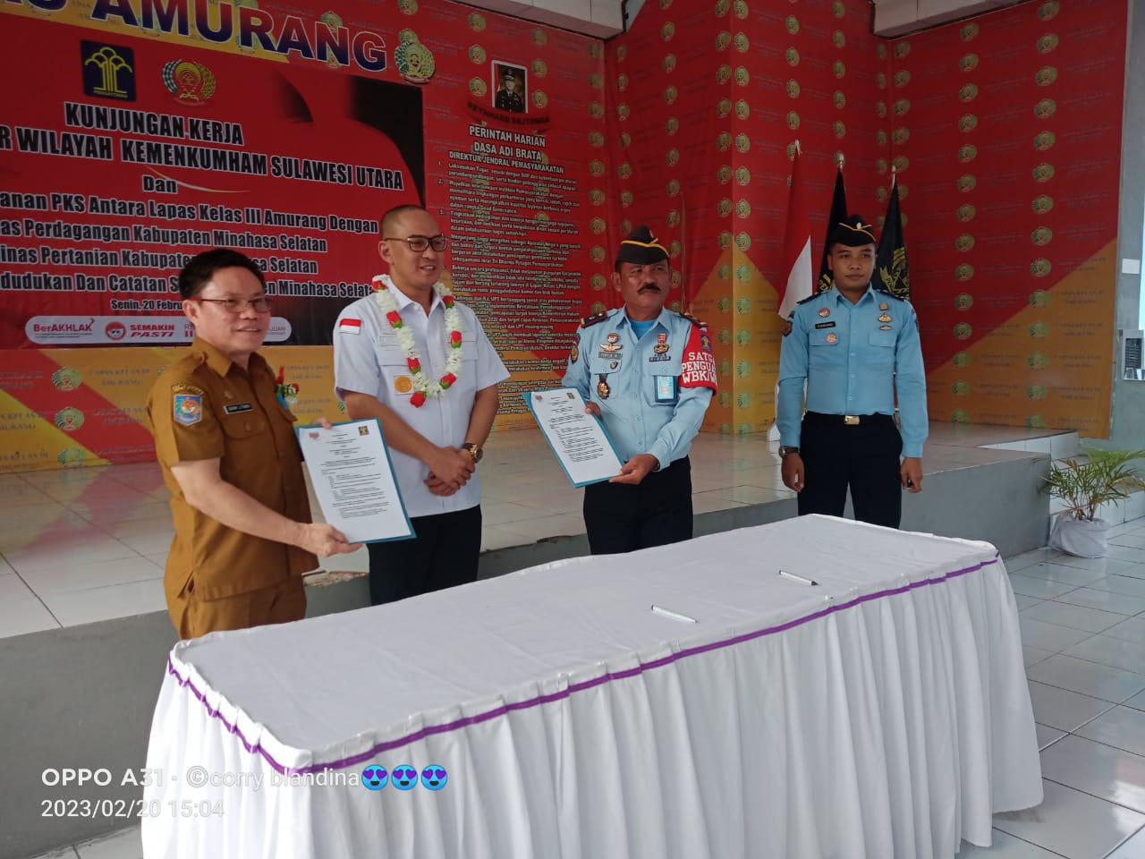 Sehubungan dengan adanya Kunjungan Kerja Kakanwil Kemenkumham Provinsi Sulawesi Utara dan juga dilaksanakannya penandatanganan Perjanjian Kerja Sama (PKS) antara Lapas Kelas III Amurang dengan ketiga Dinas di Kabupaten Minahasa Selatan, maka lewat kunjungan tersebut Kakanwil Kemenkumham Sulut DR. Ronald Lumbun dalam sambutannya mengatakan, mengapresiasi kerja sama yang di lakukan oleh Lapas Kelas III Amurang dengan Pemerintah Kabupaten Minsel melalui dinas perdagangan, dinas pertanian dan dinas kependudukan dan catatan sipil.