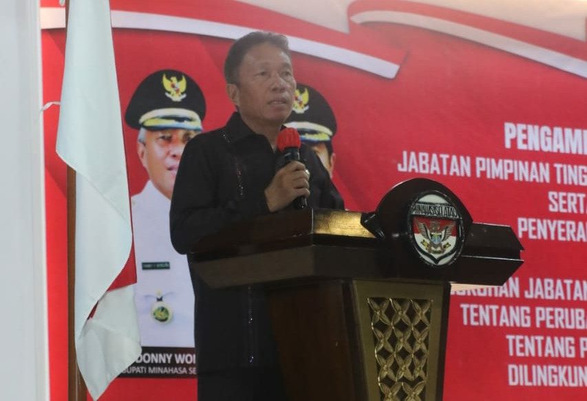 Terasnkri.com | Minsel, Sulut – Bupati Minahasa Selatan Franky Donny Wongkar SH., lakukan pengambilan sumpah janji dan pelantikan Jabatan tinggi Pratama, jabatan Administrator, jabatan Pengawas, serta tugas tambahan kepala sekolah dan penyerahan surat keputusan penjabat hukum tua dirangkaikan Pengukuhan Jabatan sesuai dengan Peraturan Daerah Nomor I Tahun 2022 tentang perubahan atas peraturan daerah nomor 6 Tahun 2016 tentang pembentukan dan Susunan Perangkat Daerah di Lingkungan Pemerintah Kabupaten Minahasa Selatan, yang dilaksanakan di Aula Waleta Kantor Bupati Minahasa Selatan. Jumat 03 Maret 2023