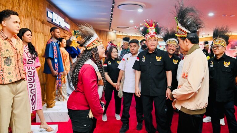 TERASNKRI.COM | PAPUA – Presiden Joko Widodo meninjau sejumlah stan produk yang dihasilkan oleh para pemuda Papua di Papua Youth Creative Hub (PYCH), Jayapura, pada Selasa, 21 Maret 2023. Dalam peninjauan tersebut, Presiden mendapat hadiah berupa jaket dari seorang perancang busana asli Papua, Eunike Yunita.
