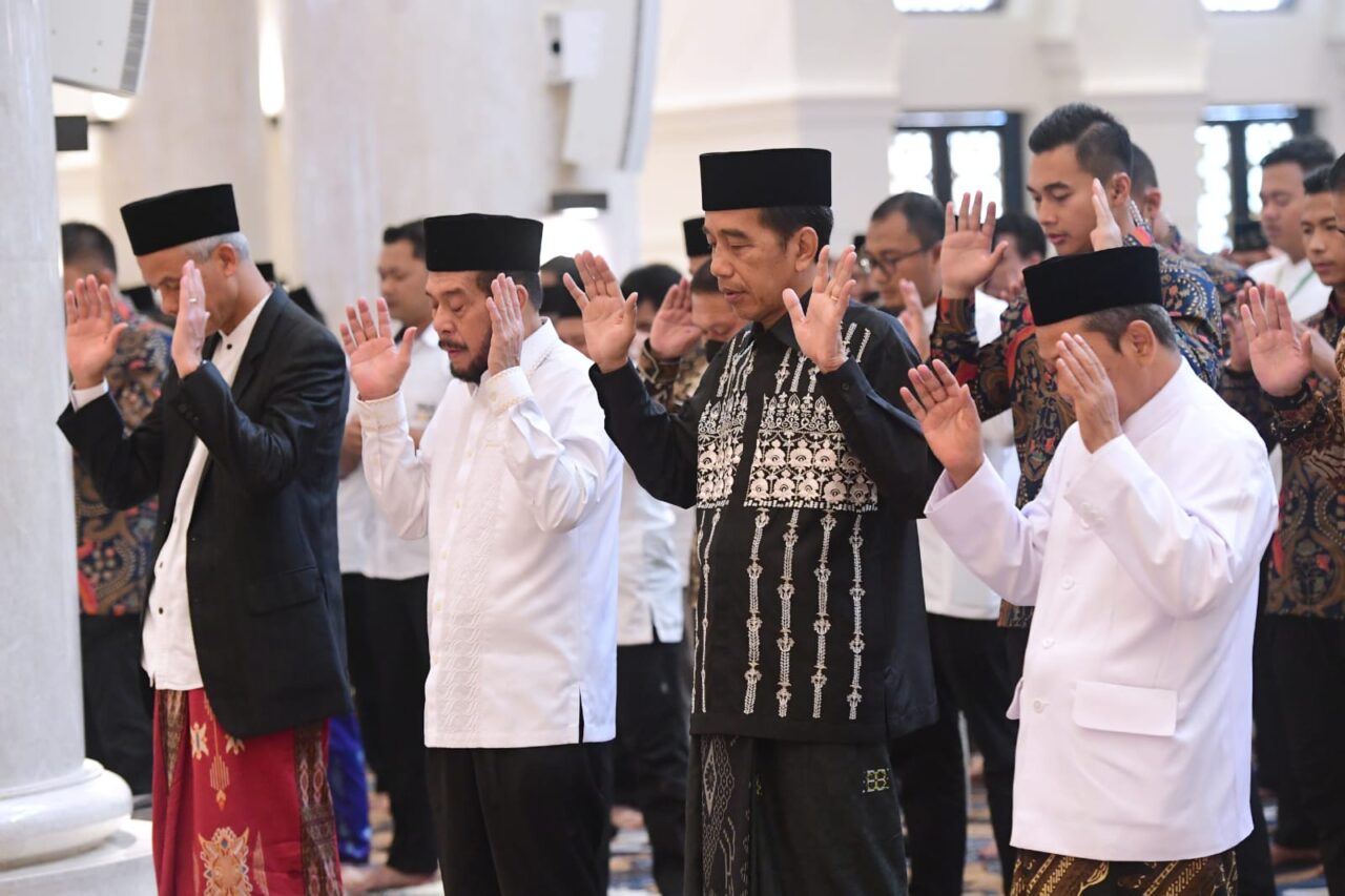 TERASNKRI.COM | JATENG – Presiden Joko Widodo dan Ibu Iriana Joko Widodo melaksanakan salat Idulfitri 1444 Hijriah di Masjid Raya Sheikh Zayed, Kota Surakarta, Provinsi Jawa Tengah, pada Sabtu pagi, 22 April 2023. Sekitar pukul 06.05 WIB, Presiden, Ibu Iriana, putra bungsunya Kaesang Pangarep beserta istri tiba di masjid.