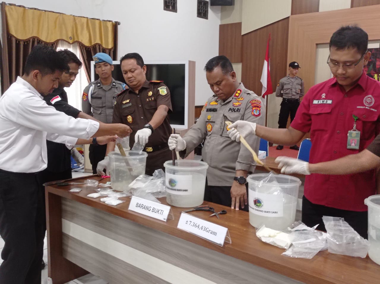 Kapolres Nunukan AKBP Taufiq Nurmandia bersama Kejari Nunukan, perwakilan Pengadilan Negeri Nunukan, serta perwakilan BNN Nunukan melakukan pemusnahan Sabu tersebut dengan cara dilarutkan dalam air keemudian dibuang kedalam kloset.