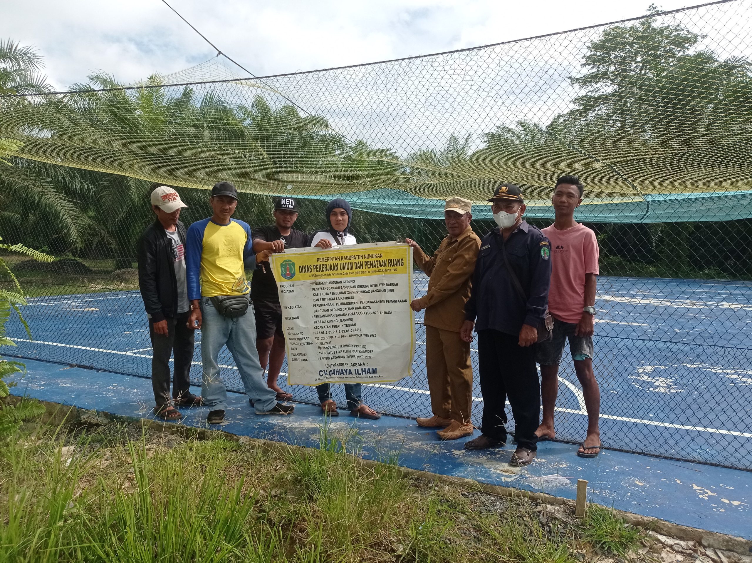 Dari papan informasi, terlihat pekerjaan Lapangan Futsal dikerjakan oleh CV. Cahaya Ilham dengan anggaran 395 Juta dan berasal dari anggaran Bantuan Keuangan Provinsi (BKP) dengan Nomor Kontrak : 620/02/SP/TB/PPK/DPUPR/CK/VII/2022. (TN001)