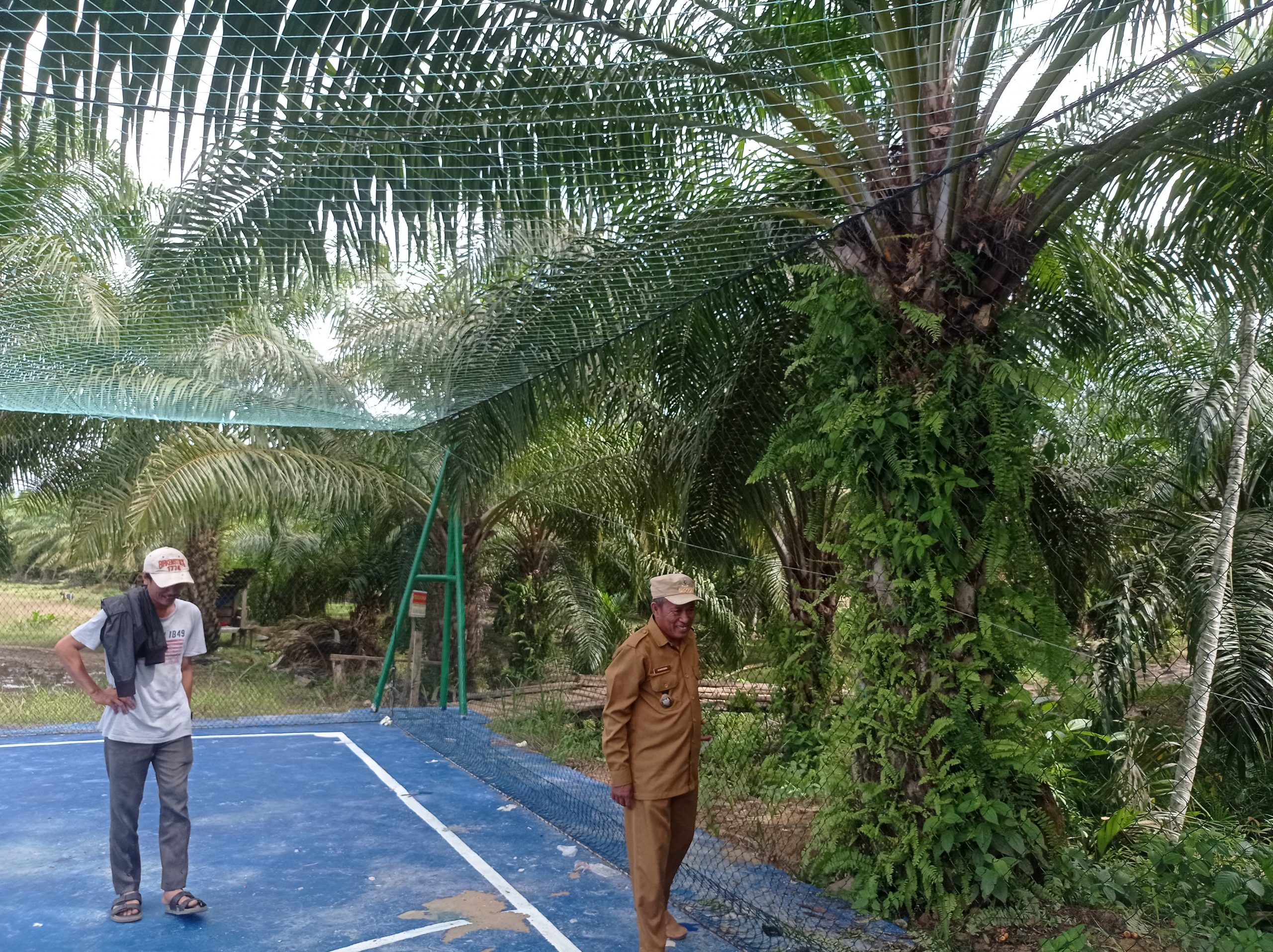 Ditambahkan Lan, pengikat penahan jaring hanya diikatkan di pelepah pohon Kelapa Sawit.
