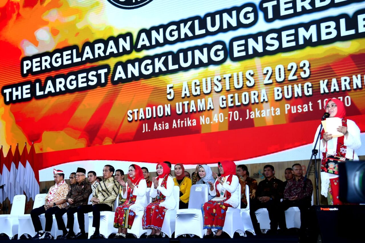 “Atas prakarsa Ibu Negara Ibu Iriana Joko Widodo, kita semua ada di sini. Sebanyak 15.240 orang peserta siap memecahkan rekor pergelaran angklung terbesar di dunia,” ucap Ketua Panitia Pergelaran Angklung, Ibu Tri Tito Karnavian dalam laporannya.