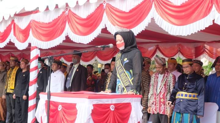 Mengenakan kostum adat, Hj Leppa tampak bersemangat membacakan Naskah Proklamasi di hadapan peserta, tamu dan undangan pada peringatan HUT RI ke 78 itu.