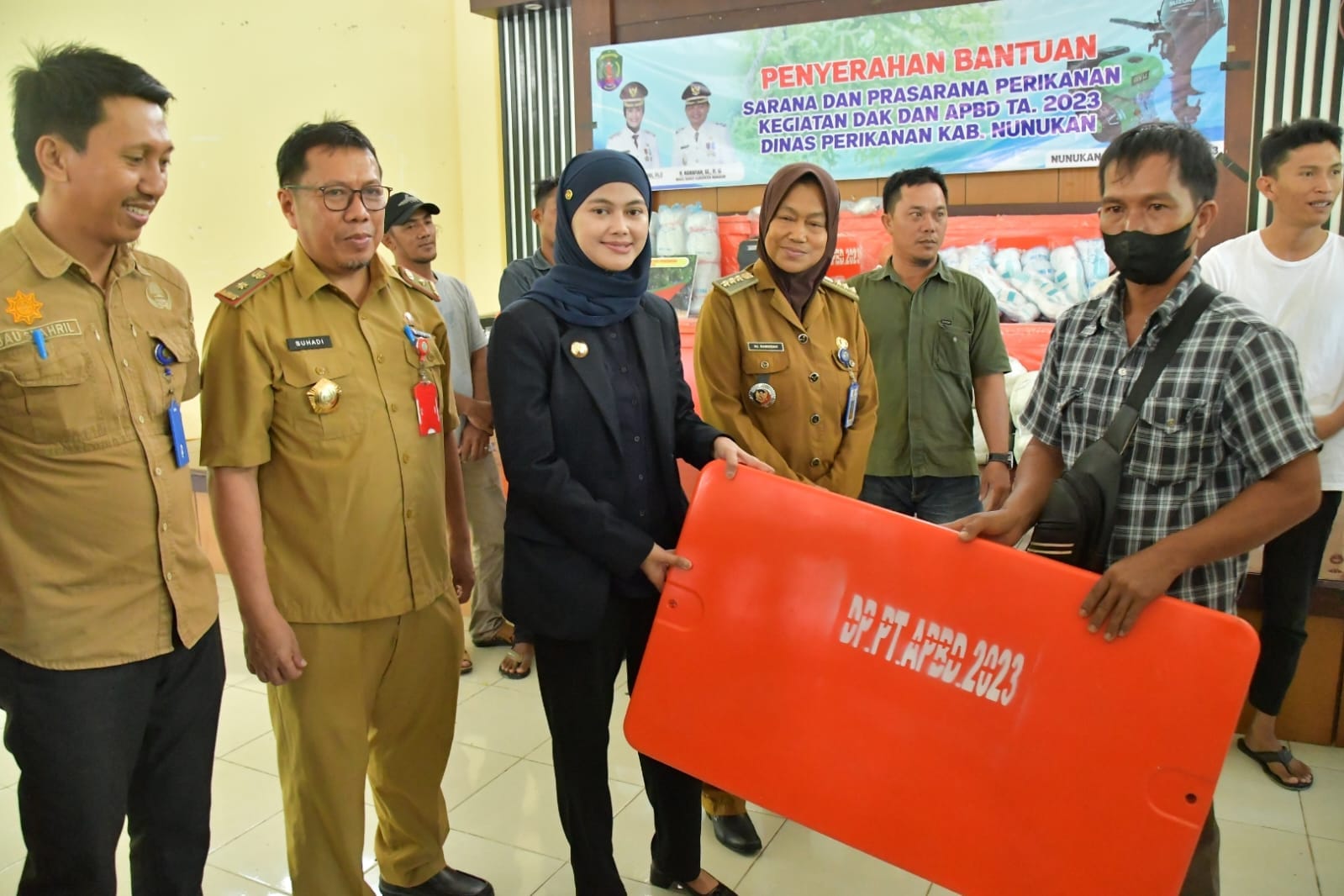 Untuk program Perikanan budidaya bantuan berupa perahu, mesin ketinting, tali, pelampung, terpal, tali anting, lantai jemur, bibit ikan tawar dan pakannya serta bibit ikan bandeng dan pakan, yang diserahkan langsung oleh Bupati Laura di Aula Gadis I Nunukan, Selasa 12 September 2023.
