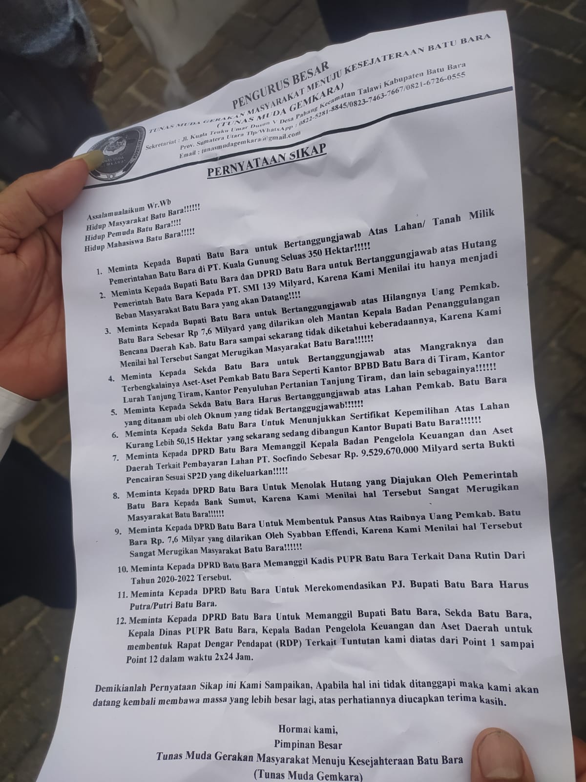 Diketahui tuntutan aksi 4 Januari 2023 itu, T.M. Gemkara melalui kordinator aksi Ismail bahwa ada 12 tuntutan, satu diantaranya meminta agar Bupati Batu Bara bertanggung jawab atas hilangnya Kepala Badan Penanggulangan Bencana Daerah ( BPBD ) berinisia S sejak nopember 2022, dan diduga melarikan uang kas Pemda sebesar 7, 6 Milyar, namun jajaran Pemerintah Daerah dan Polres Batu Bara tanpak tidak melakukan proses hukum.