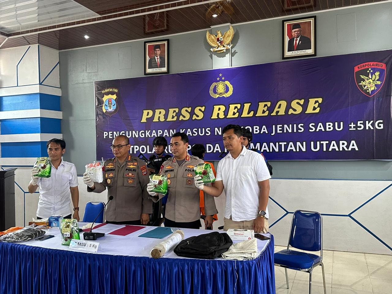 TERASNKRI.COM | TARAKAN, KALTARA – Ditpolairud Polda Kaltara berhasil mengungkap kasus 5 Kilo yang diduga narkotika Gol I jenis Sabu, hal tersebut di sampaikan Dirpolairud Polda Kaltara Kombes Bambang Wiriawan pada press release di Mako Ditpolairud Polda Kaltara, Rabu (27/12/2023)