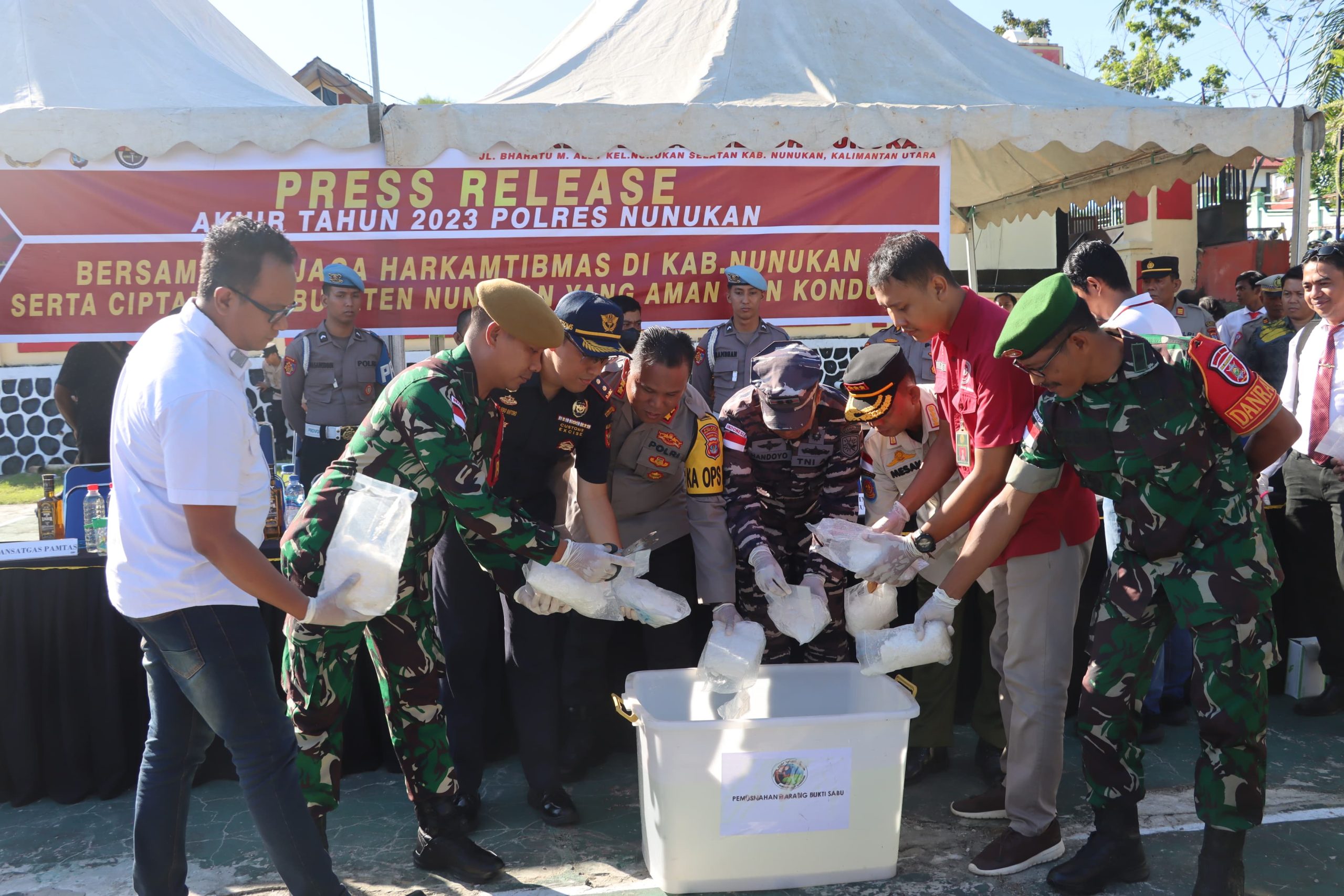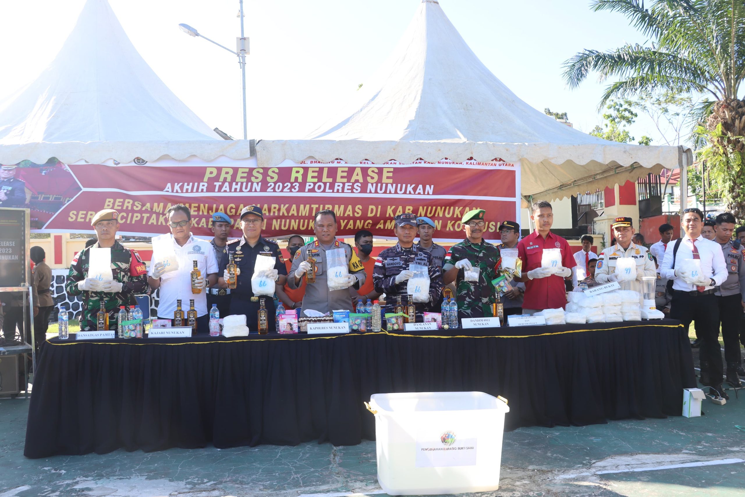Dari data Polres Nunukan untuk barang bukti Narkoba di sepanjang tahun 2023 didominasi Sabu sebanyak 88.772,29 Gram (88,7Kg), 168 butir Extacy dan cairan liquid Narkoba @10ml sebanyak 30 botol.