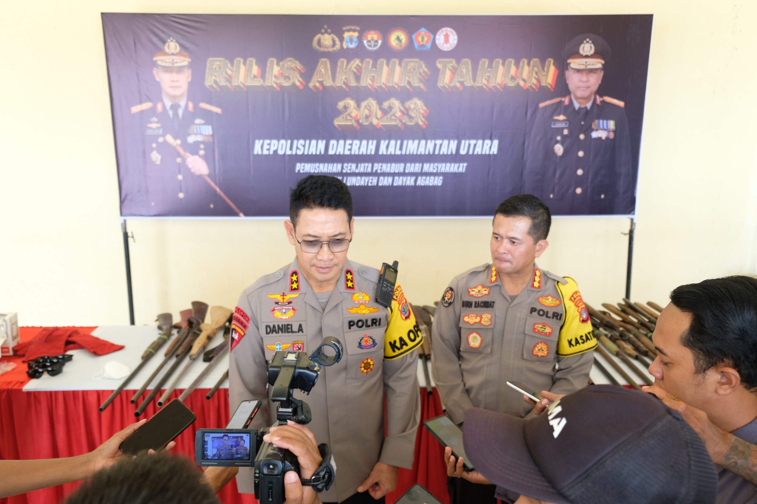 TERASNKRI.COM | BULUNGAN, KALTARA – Dalam rangka menyampaikan pencapaian serta transparansi kinerja, Kapolda Kaltara Irjen Pol Daniel Adityajaya, S.H., S.I.K., M.Si. didampingi Oleh Kabid Humas, Karo Ops, Dir Intelkam, Kabid TIK, Kabid Propam merilis hasil ungkapan senjata api rakitan yang diserahkan oleh Tokoh Adat yang ada di Kab. Bulungan, Jumat (29/12/2023)