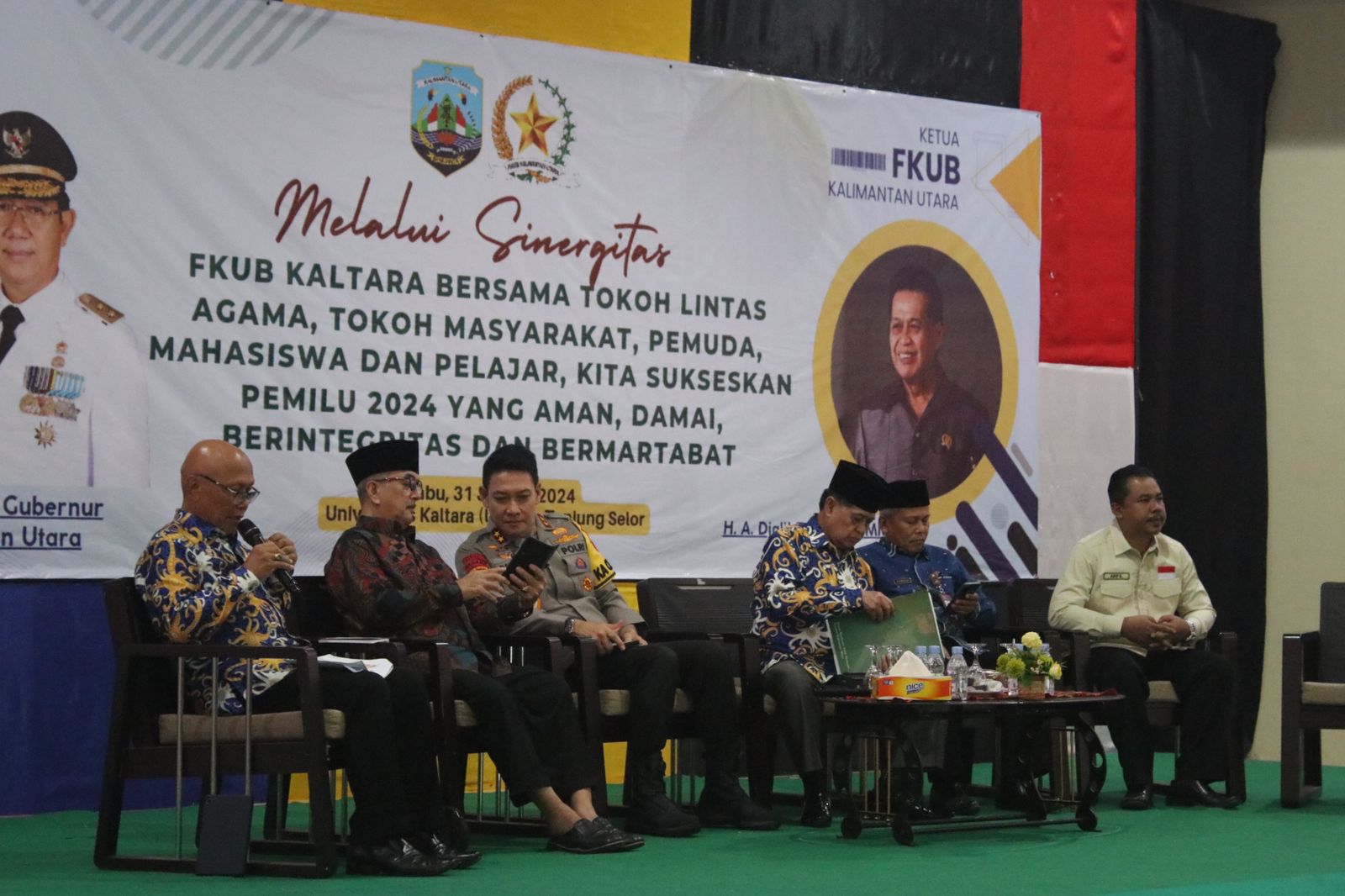 Kegiatan yang diselenggarakan ini mengusung tema “Melalui Sinergitas, FKUB Kaltara Bersama Tokoh Lintas Agama, Tokoh Masyarakat, Pemuda, Mahasiswa dan Pelajar, Kita Sukseskan Pemilu 2024 yang Aman, Damai, Berintegritas dan Bermartabat”.