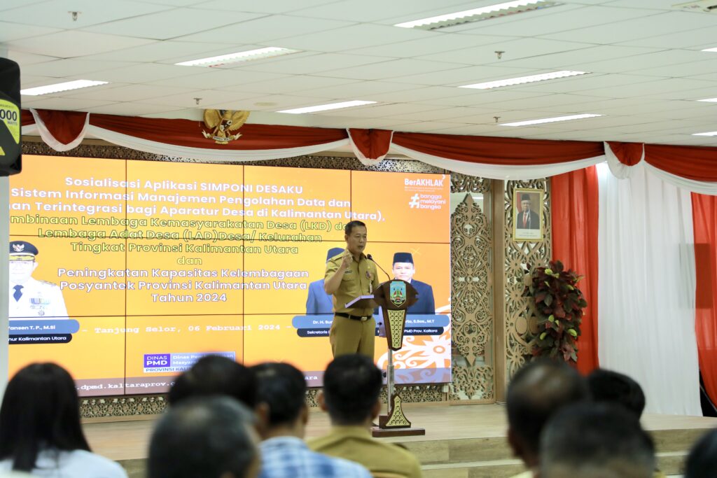 TERASNKRI.COM | TANJUNG SELOR, KALTARA – Asisten bidang Pemerintahan dan Kesejahteraan Rakyat Setprov Kaltara, Datu Iqro Ramadhan, S.Sos., M.Si. resmi membuka Sosialisasi Aplikasi Sistem Informasi Manajemen Pengolahan Data dan Pelatihan Terintegrasi Bagi Aparatur Desa Di Kalimantan Utara (Simponi Desaku). Acara tersebut dibarengi dengan Pembinaan Lembaga Kemasyarakatan Desa (LKD) dan Lembaga Adat Desa (LAD) Tingkat Provinsi Kalimantan Utara dan Peningkatan Kapasitas Kelembagaan Posyantek dalam Pemanfaatan Teknologi Tepat Guna (TTG) Provinsi Kaltara, di Lantai 1 Ruang Serbaguna Gedung Gadis Provinsi Kaltara, Selasa (6/2/2024).