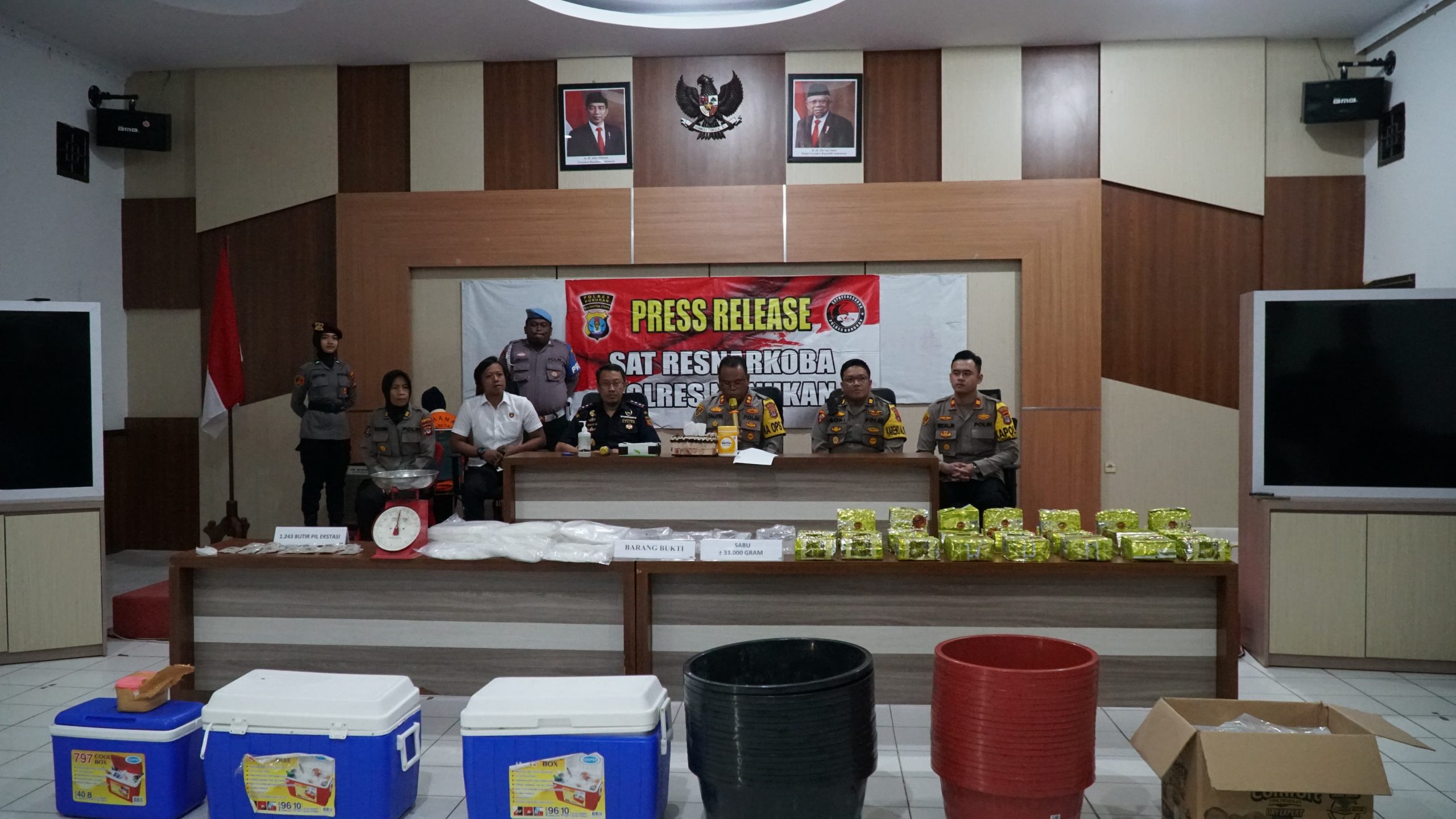 1. 1 baskom plastik warna hitam bertumpuk ditemukan bungkusan teh cina QUANYINWANG sebanyak 12 bungkus diduga berisi sabu sabu dgn berat perbungkusnya ± 1000 gram serta Pil Ekstasi sebanyak 1.243 butir merk LV.