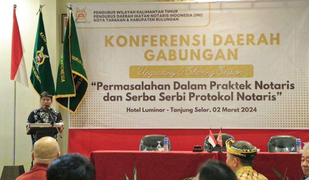 TERASNKRI.COM | TANJUNG SELOR, KALTARA – Gubernur Kaltara, DR. (HC). H. Zainal A. Paliwang, M.Hum membuka Konferensi Daerah (Konferda) Gabungan Ikatan Notaris Indonesia (INI) Pengurus Daerah (Pengda) Tarakan dan Bulungan, di Ballroom Hotel Luminor, Sabtu (2/3). Gubernur dalam sambutannya berharap konferda menjadi wadah agar para notaris mampu meningkatkan profesionalitas dan kualitas pelayanan kepada masyarakat.