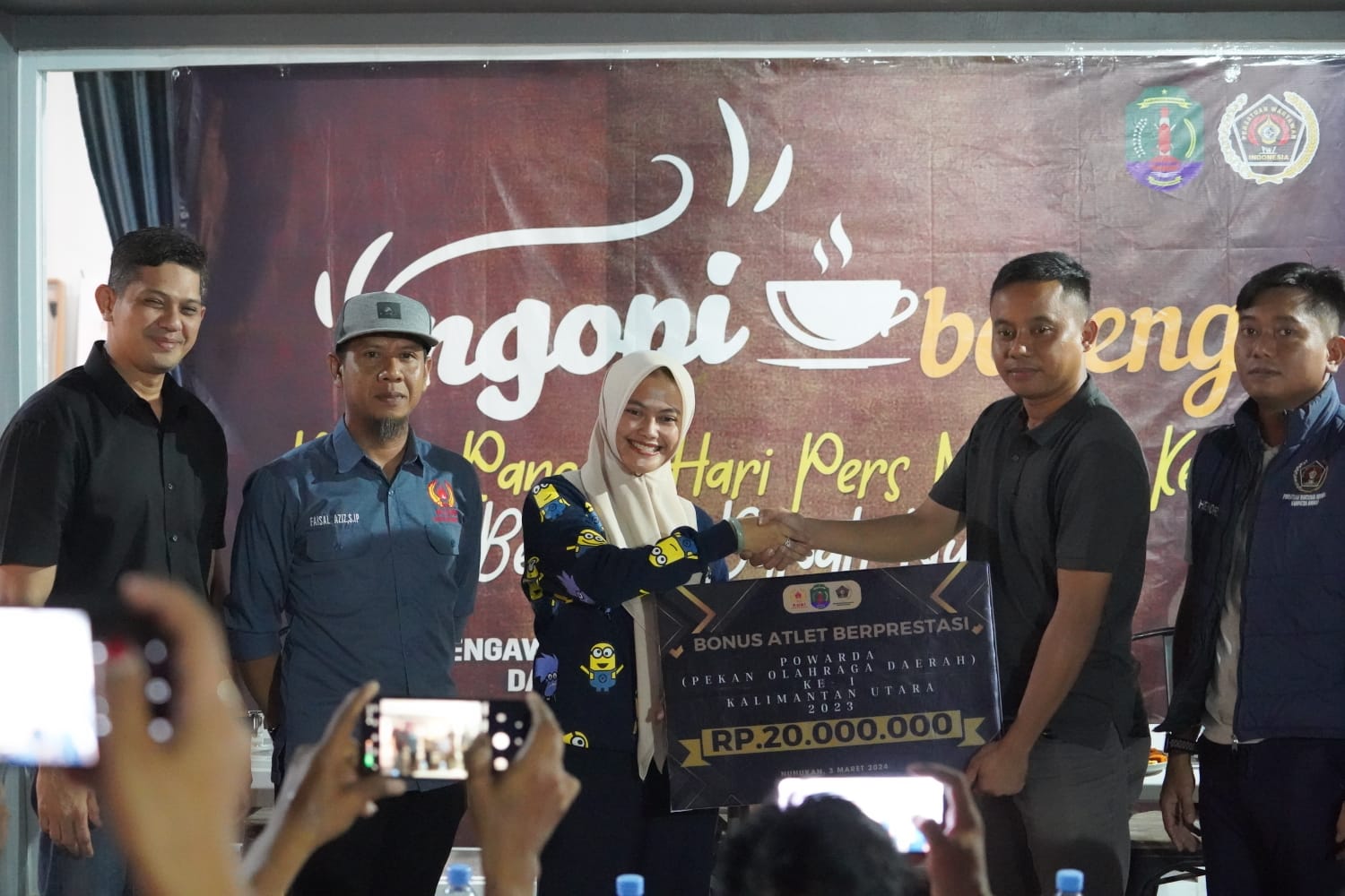 Bonus diserahkan langsung oleh Bupati Nunukan Hj. Asmin Laura Hafid SE., MM., PhD Kepada Ketua SIWO Nunukan Alamsyah, Minggu (3/3/2024) malam di sela-sela kegiatan Ngopi Bareng Bupati dalam rangkaian peringatan Hari Pers Nasional (HPN) bersama seluruh wartawan di Kabupaten Nunukan.