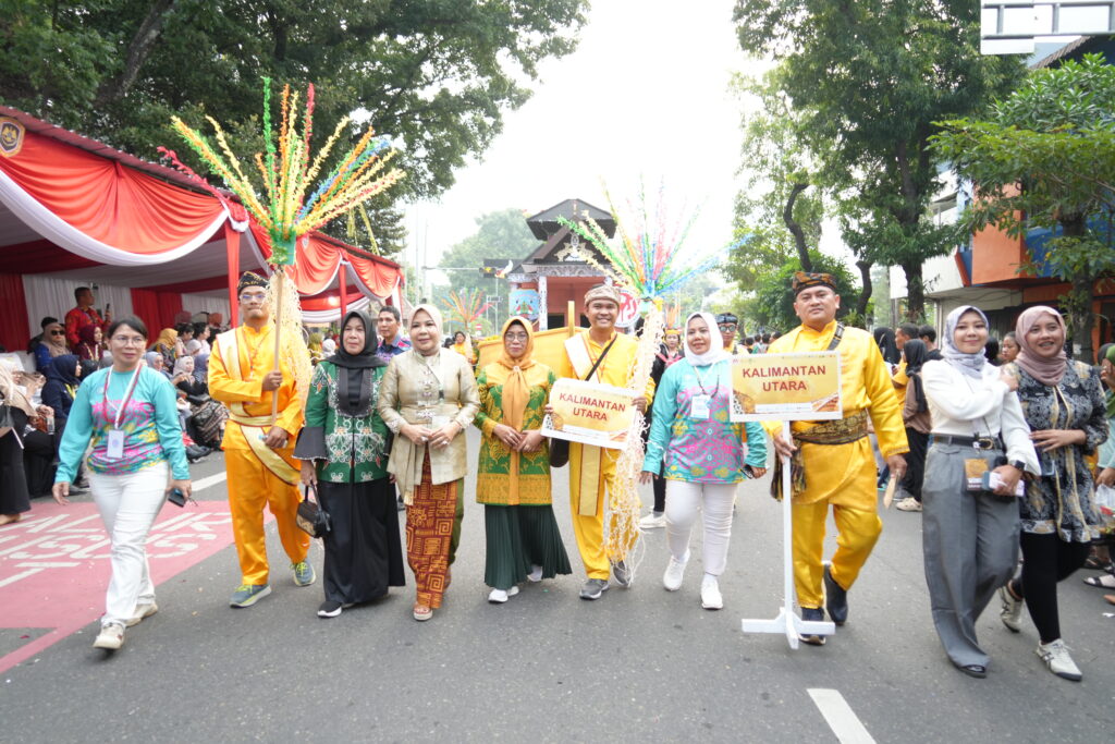 Hj Rahmawati sendiri sempat berpartisipasi ketika mobil hias Kaltara melewati panggung VIP. Didampingi Wakil Ketua Harian Dekranasda Kaltara, Sekretaris Dekranasda Kaltara serta Sekretaris Umum TP-PKK Kaltara, ia turut menari bersama penari yang mengiringi mobil hias Kaltara. (TN-Adv/DKISP Kaltara)