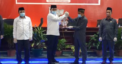 “Demikian pula sebagai daerah dalam menghadapi tantangan, ujian dan cobaan yang sering terasa amat berat dan kompleks, kita harus tetap tegar tidak boleh menyerah justru semakin kompak, rukun dan bersatu, jangan kita saling salah menyalahkan, marilah dengan penuh kesadaran kita bekerja lebih keras lagi menjemput kemakmuran yang dijanjikan Allah dalam Al Qur’an.” Imbuhnya.