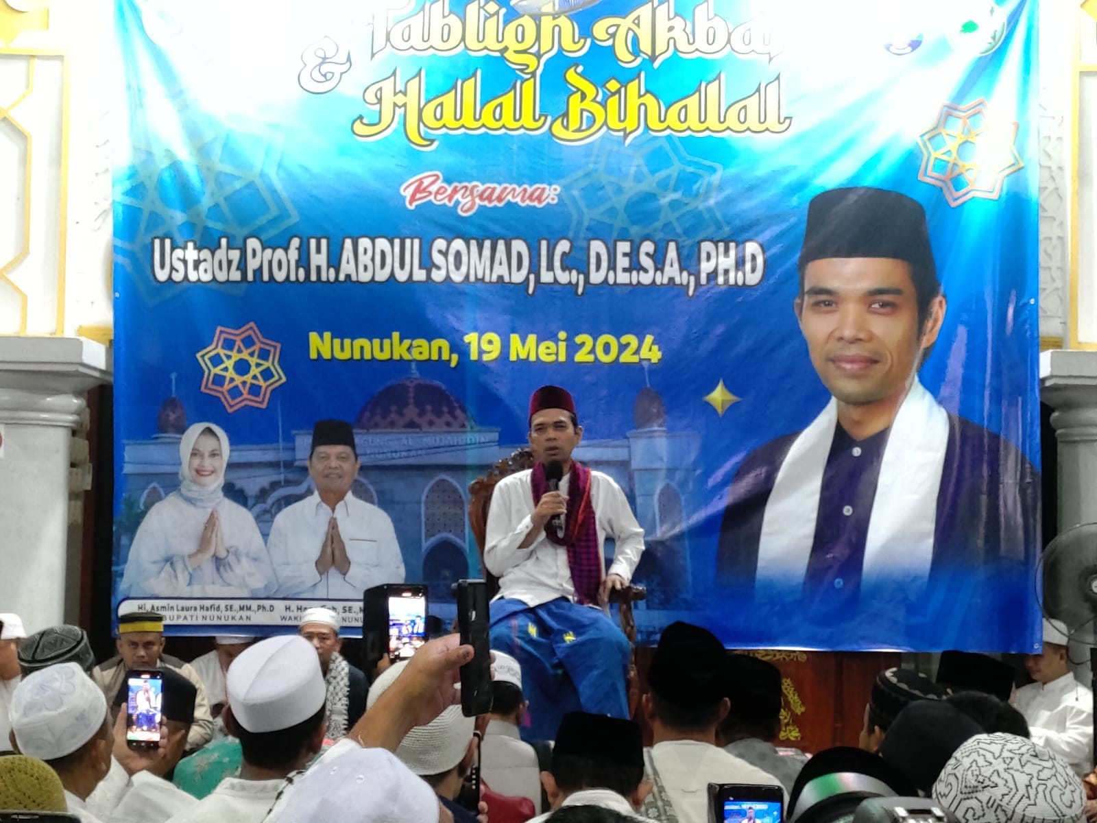 TERASNKRI.COM | NUNUKAN, KALTARA – Bupati Nunukan Hj. Asmin Laura Hafid menghadiri Tabligh Akbar dan Halal Bihalal bersama Ustadz Abdul Somad (UAS) di Masjid Agung Al Mujahidin, Nunukan, Minggu (19/05/2024)