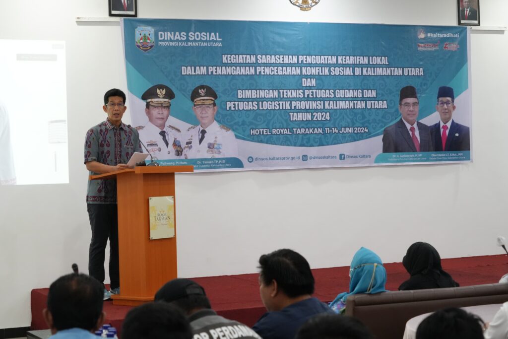 TERASNKRI.COM | TARAKAN, KALTARA – Dinas Sosial Provinsi Kalimantan Utara (Kaltara) melaksanakan kegiatan sarasehan penguatan kearifan lokal dalam penanganan pencegahan konflik sosial di Kaltara dan bimbingan teknis (Bimtek) petugas gudang dan petugas logistik Provinsi Kaltara tahun 2024 di Hotel Royal Tarakan, Rabu (12/6/2024).