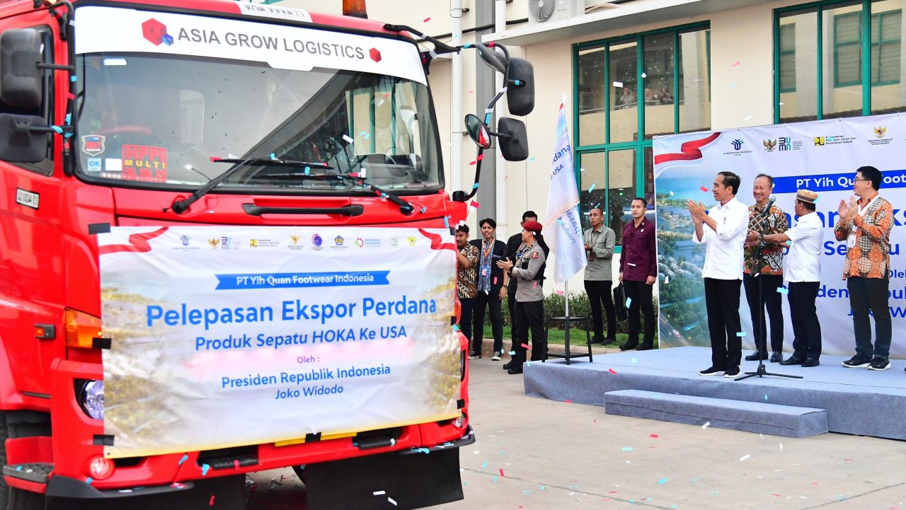 “Hari ini kita akan melepas ekspor perdana 16 ribu pasang sepatu merk Hoka ke Amerika yang diproduksi oleh perusahaan Yih Quan Footwear Indonesia, salah satu produsen alas kaki terkemuka asal Taiwan,” ujar Presiden dalam sambutannya.