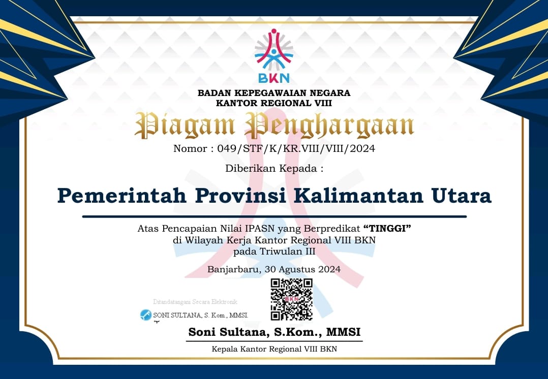 TERASNKRI.COM | TANJUNG SELOR, KALTARA – Pemerintah Provinsi (Pemprov) Kalimantan Utara (Kaltara) kembali mencatat prestasi dengan menerima Piagam Penghargaan dari Badan Kepegawaian Negara (BKN) atas pencapaian Nilai Indeks Profesionalitas Aparatur Sipil Negara (IPASN) yang berpredikat “Tinggi”.