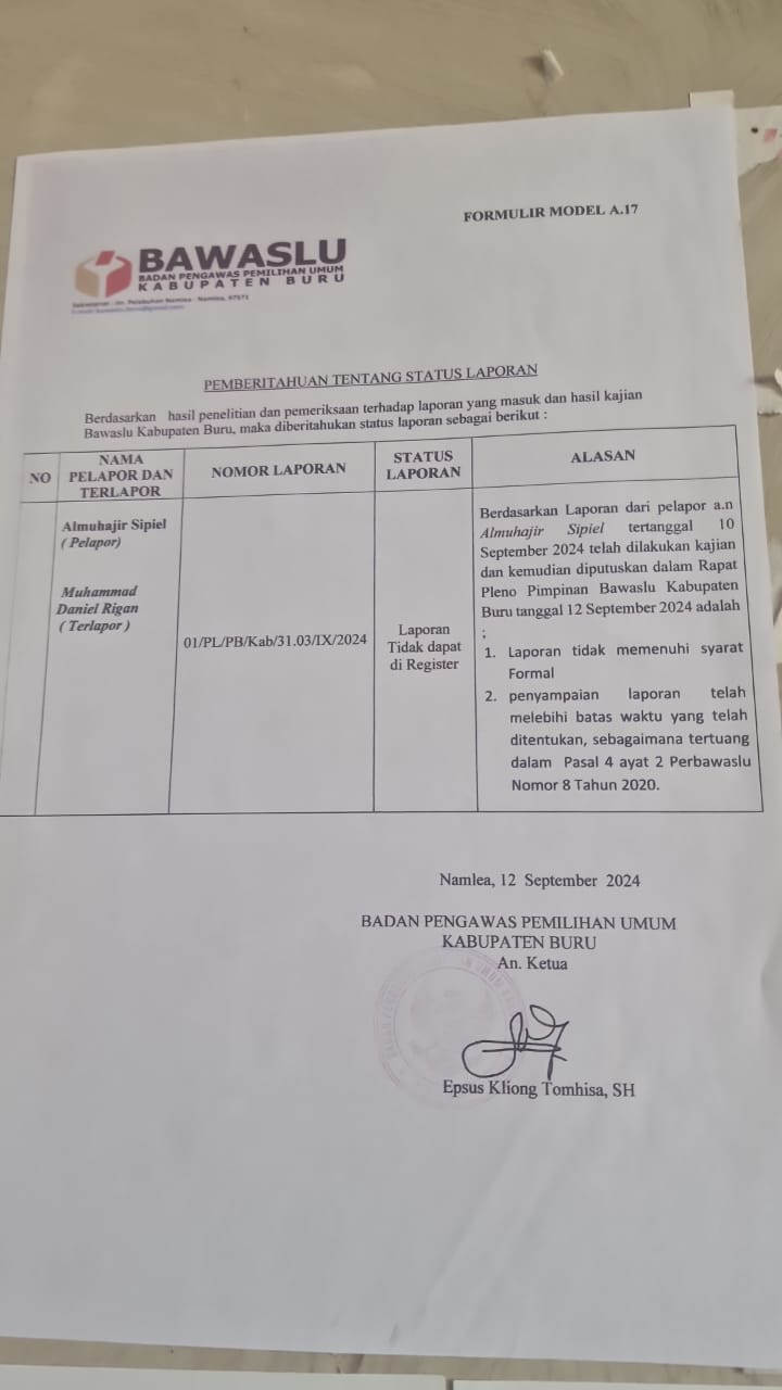 Atas laporan itu, Bawaslu Buru melakukan pengkajian dan hasilnya telah disampaikan ke pihak pelapor dan ditempel pada papan pengumuman kantor Bawaslu pada hari Jumat (13/9/2024).