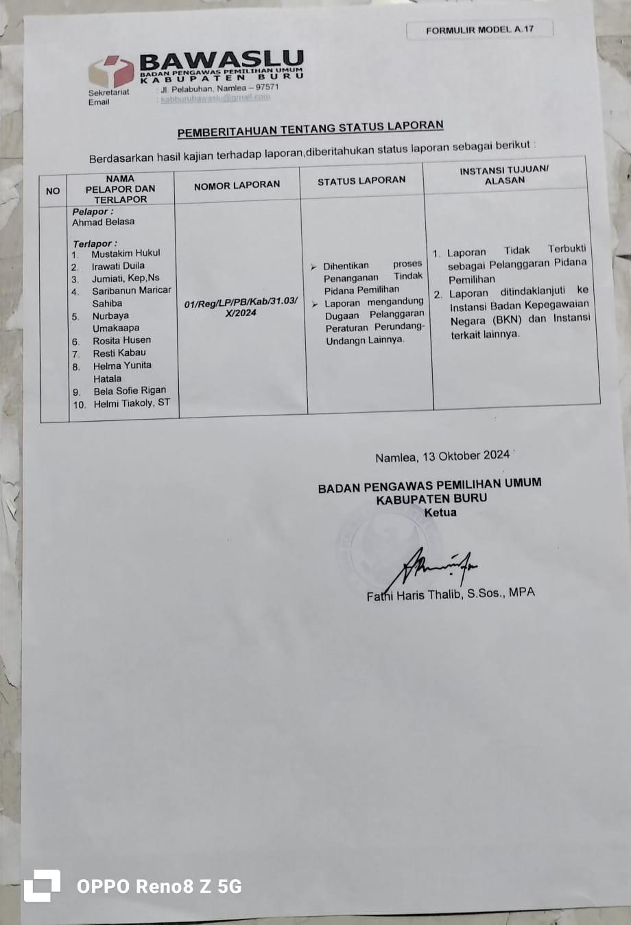Humas Bawaslu Kabupaten Buru, Taufan Fanolong menjelaskan berdasarkan hasil kajian terhadap laporan dari Ahmad Belasa, Bawaslu dan Gakumdu telah mengambil langkah-langkah sesuai Perbawaslu Nomor 9 tahun 2024.
