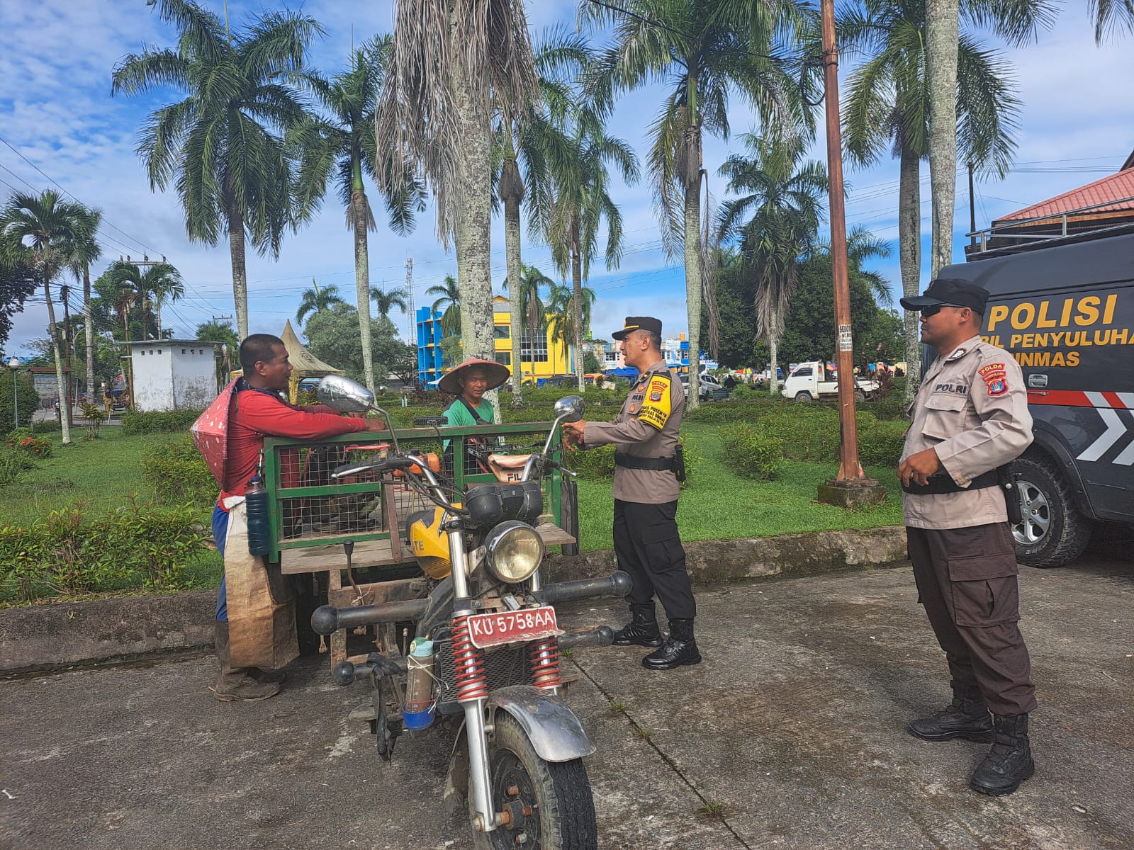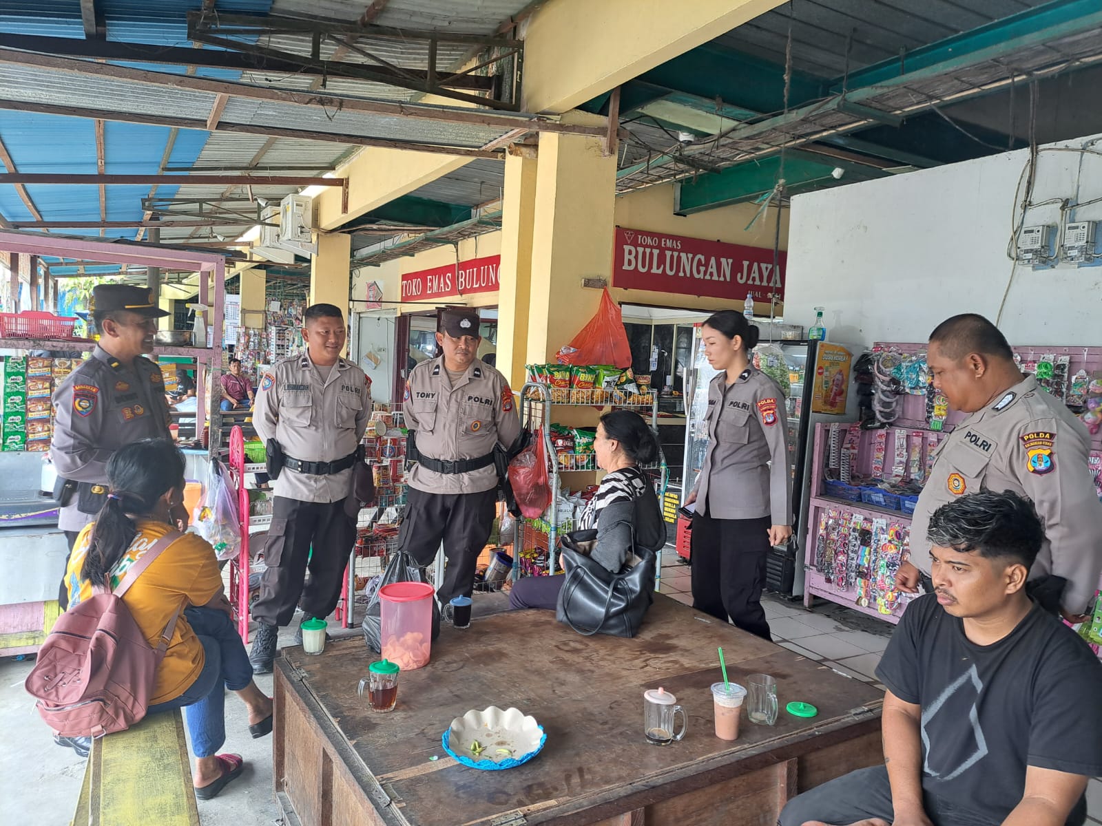 Berlokasi di Pasar Induk Tanjung Selor, Kabupaten Bulungan, personel Ditbinmas Polda Kaltara melaksanakan patroli dialogis yang penuh keakraban.