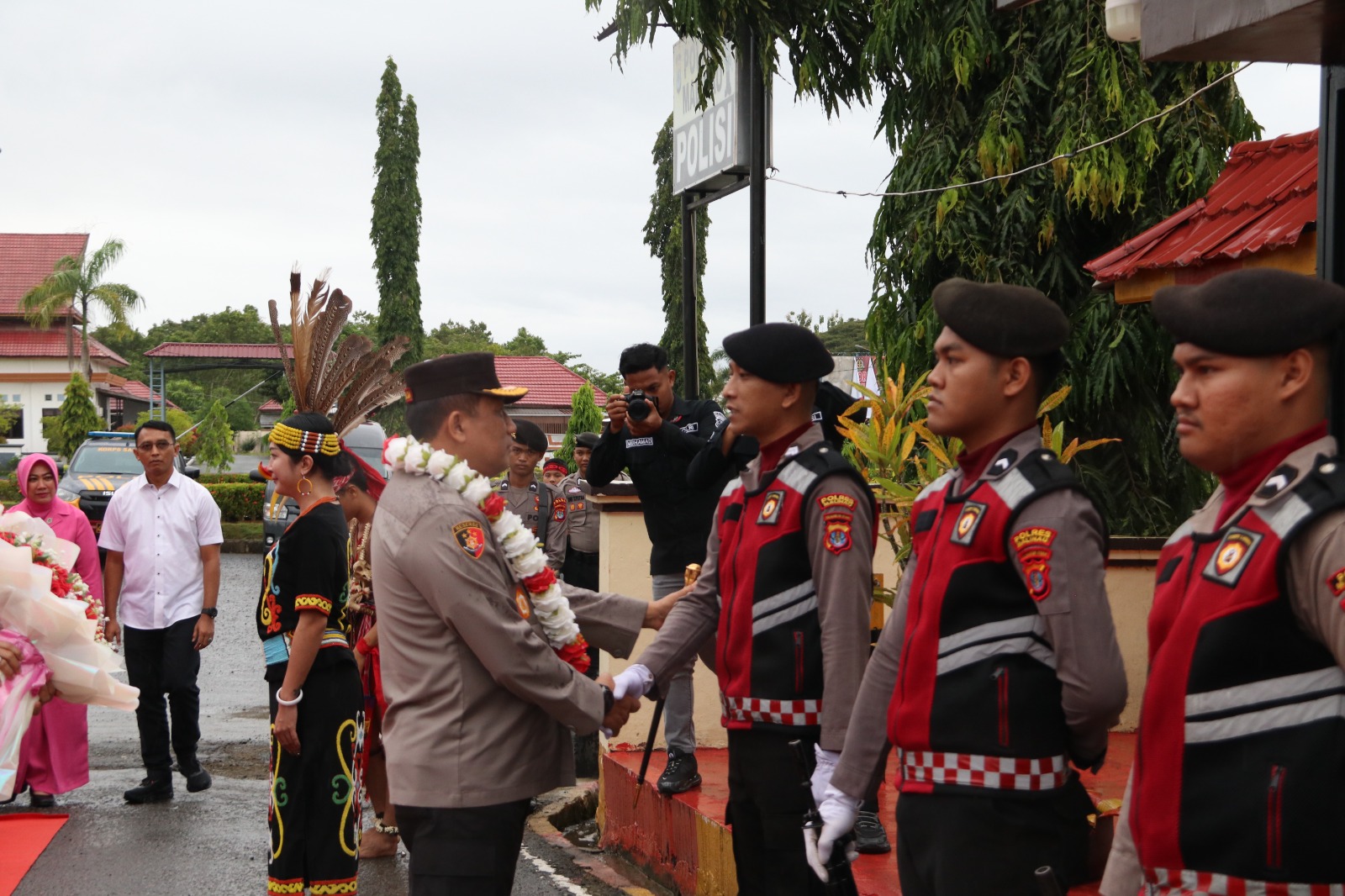 Setibanya di Polres Malinau, Kapolda dan Ketua Bhayangkari menerima penyambutan tradisional berupa prosesi tepung tawar, pengalungan bunga, serta pemberian buket bunga kepada Ketua Bhayangkari Daerah Kalimantan Utara.