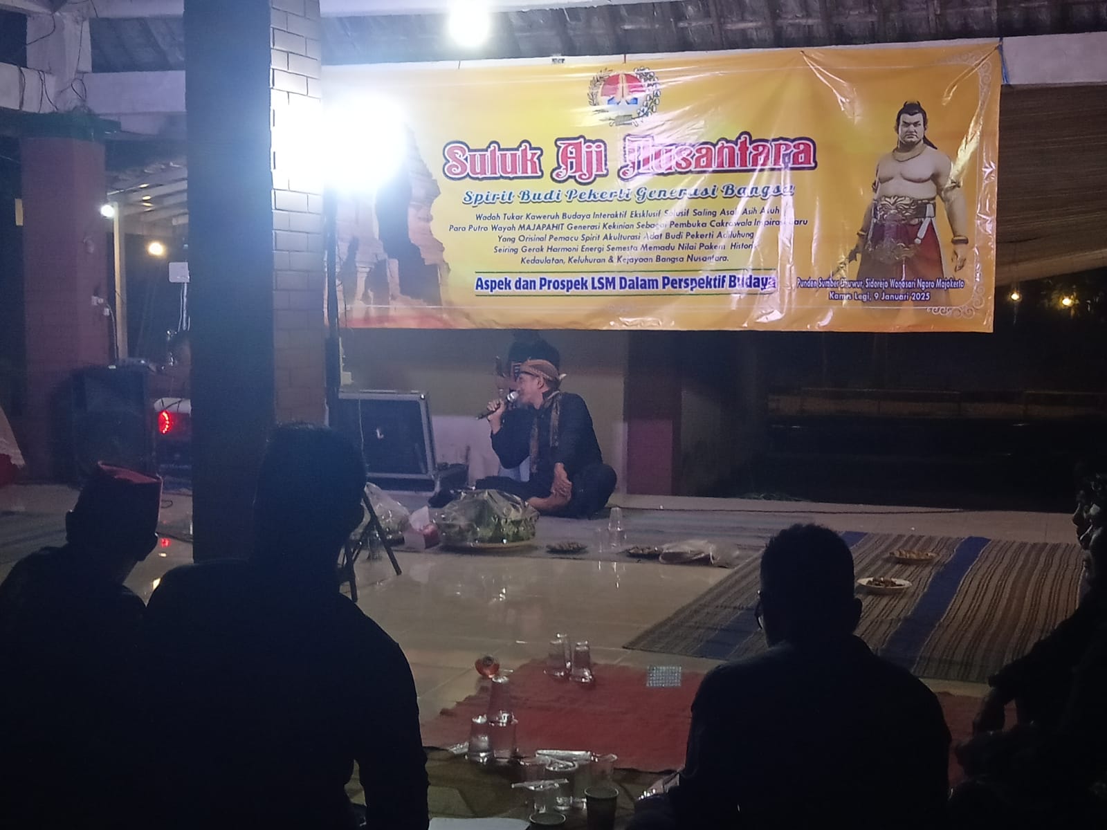 Sebagai salah satu wadah untuk tokoh tokoh pegiat budaya di wilayah Mojokerto Raya Suluk Aji Nusantara menegaskan bahwa acara kemarin malam merupakan agenda yang ke 8, didalam rutinitas kegiatannya. Tema yang diangkat di acara diskusi bersama ialah aspek dan prospek LSM (Lembaga Swadaya Masyarakat) dalam prespektif budaya.