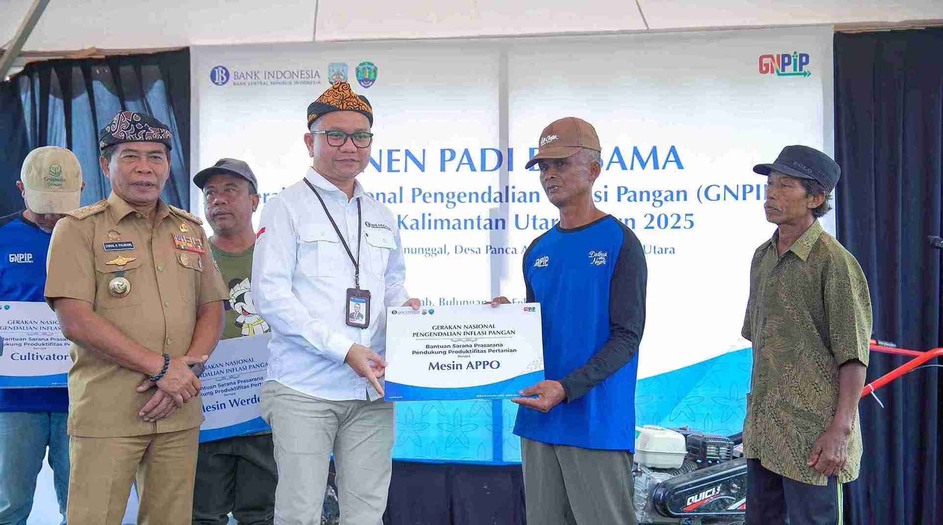 Di momen tersebut Gubernur Zainal A. Paliwang dan Kepala Perwakilan Pak Ando turut menyerahkan secara simbolis fasilitasi peralatan pendukung pertanian seperti mesin weeder, mesin appo, dan cultivator kepada Gapoktan Manunggal di Desa Panca Agung yang dilanjutkan bersama-sama memanen padi organik sebagai simbol ketahanan pangan. (TN/KPwBI Kaltara)