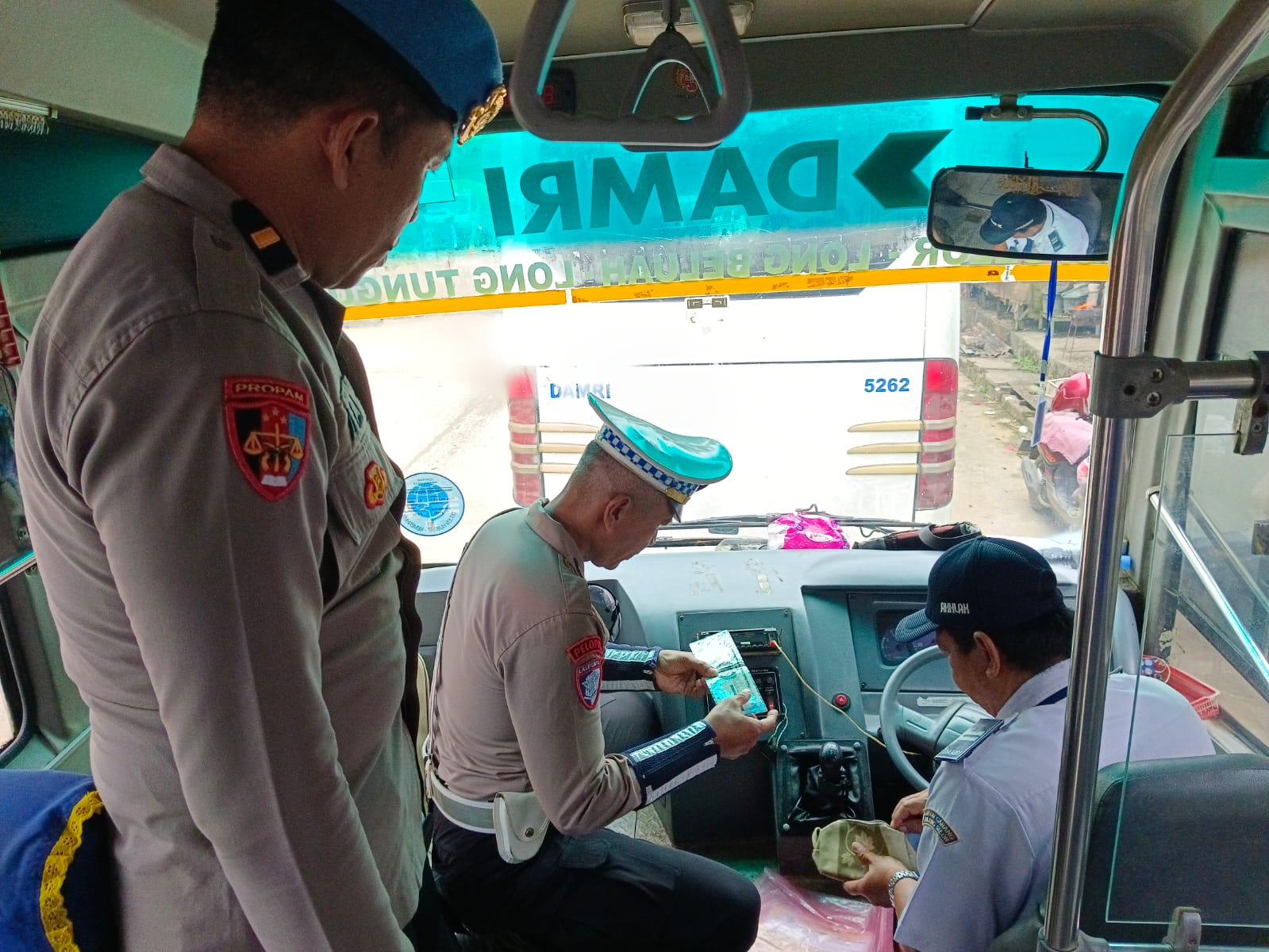 Bertempat di Terminal Damri Jl. Sengkawit Pasar Induk Tanjung Selor, Personel Satgas Preemtif Ops Keselamatan Kayan 2025 melaksanakan kegiatan ramp check kenderaan Bus Damri. Jumat (14/02/2025).