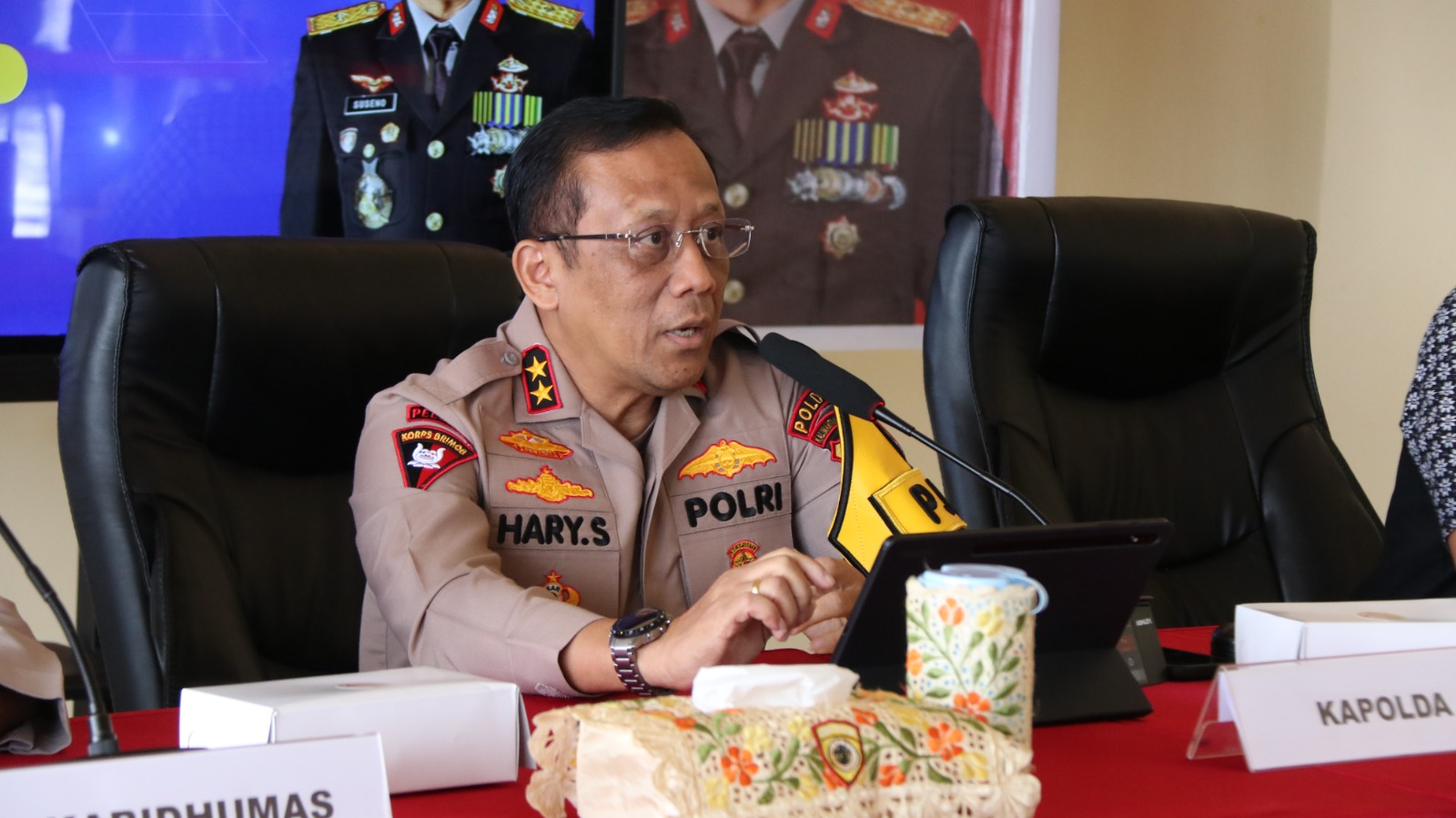 TERASNKRI.COM | TANJUNG SELOR, KALTARA — Polda Kaltara menggelar konferensi pers resmi bertempat di Selasar Gedung B Mapolda Kaltara terkait insiden yang terjadi saat pelayanan pengamanan aksi unjuk rasa di depan Mako Polda Kaltara, dimana terdapat mahasiswa mengalami luka bakar akibat tersambar api ketika membakar ban. Kegiatan ini dipimpin langsung oleh Kapolda Kaltara, Irjen Pol Hary Sudwijanto, S.I.K., M.Si., didampingi Kabid Humas Budi Rachmat, S.I.K., M.Si. dan Dirreskrimum Polda Kaltara Kombes Pol Yudhistira Midyahwan, S.I.K., S.H., M.Si. Serta dihadiri oleh Yunus Luat (tokoh Tidung), Dr. Budi (tokoh Jawa), Joko Supriyadi S.T M.T (ketua Forum Intelektual Kaltara), Hieskel (Federasi Serikat pekerja metal Indonesia ), dan insan Pers. Jumat (18/07/2025)