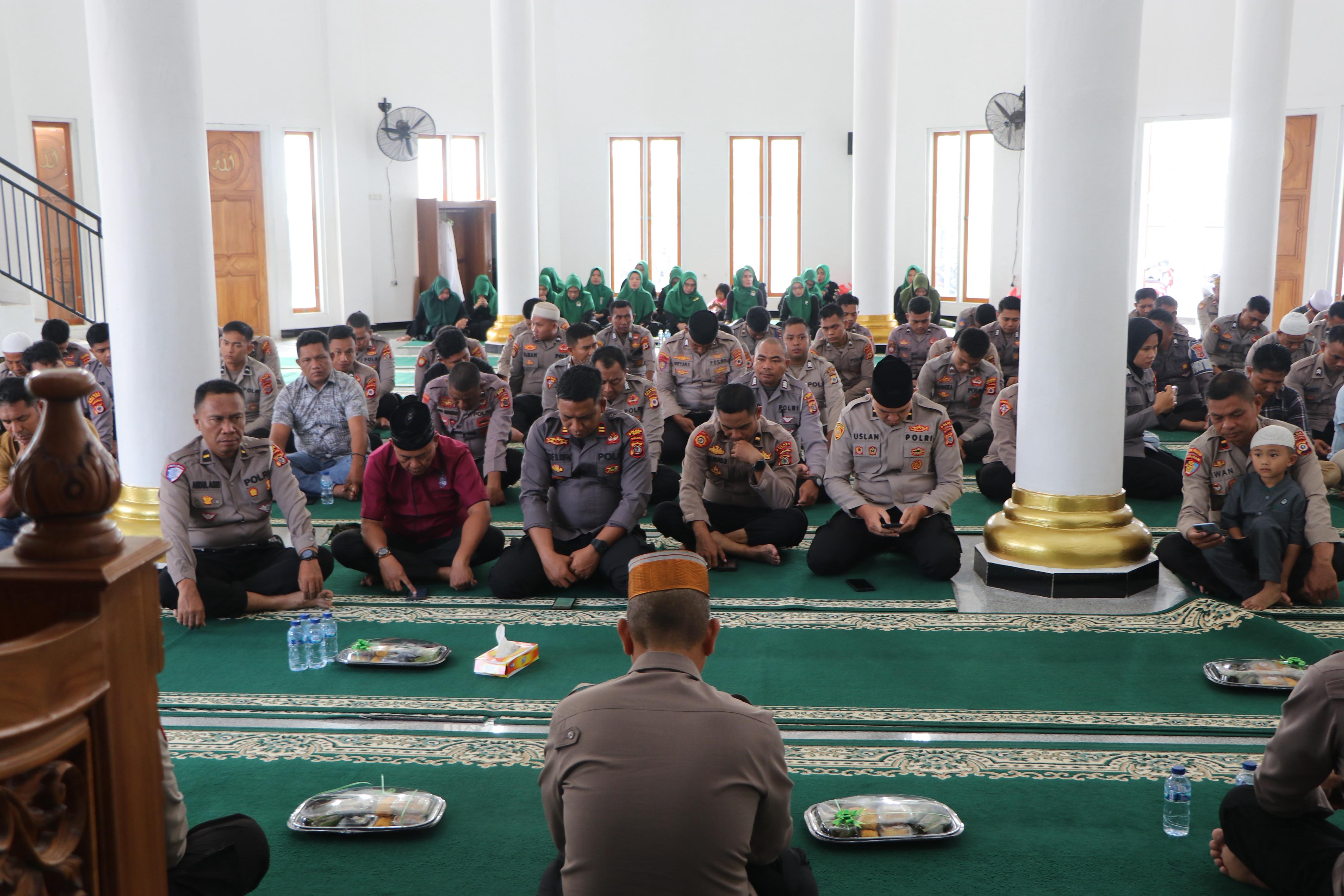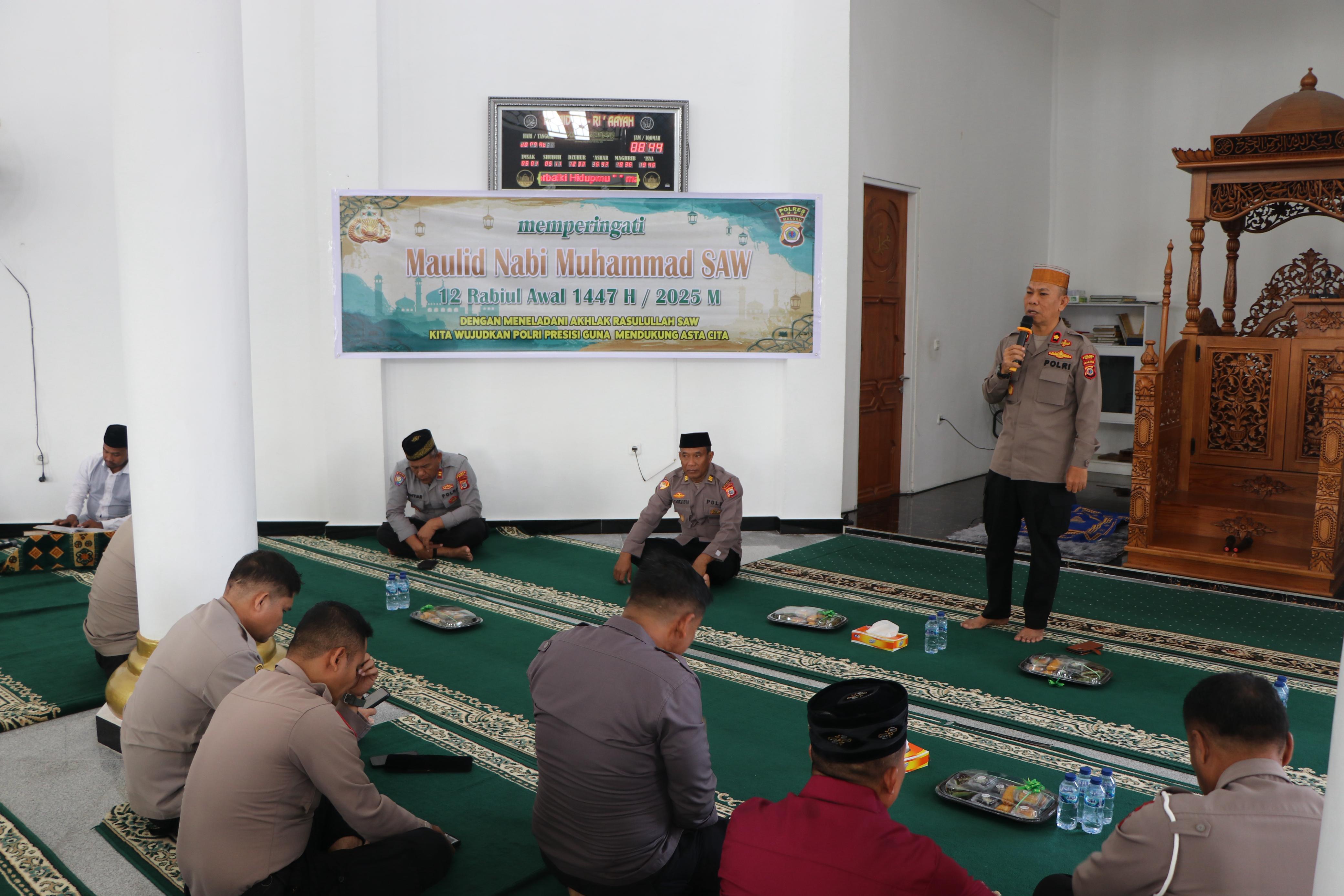 Dalam sambutannya, Kompol H. Akmil Djapa Haridi menyampaikan bahwa peringatan Maulid Nabi Muhammad SAW bukan hanya seremoni keagamaan, tetapi juga menjadi momentum penting untuk merefleksikan kembali keteladanan Rasulullah sebagai pemimpin yang jujur, amanah, serta berakhlak mulia.