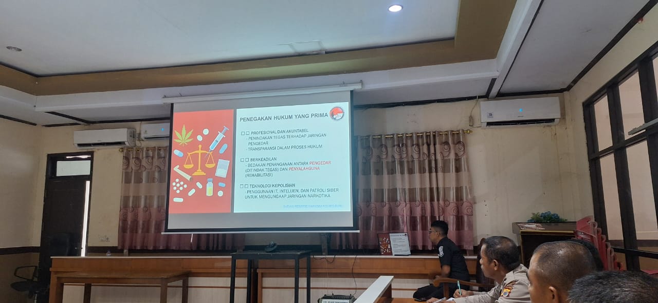 Kegiatan rapat diawali dengan paparan oleh Kasat Narkoba, Iptu Dede S. Rifai, S.H., yang menyampaikan perkembangan situasi peredaran dan penindakan kasus narkotika di wilayah hukum Polres Buru. Beliau menyoroti pentingnya sinergi antar fungsi dalam memerangi peredaran gelap narkoba, yang menjadi salah satu fokus utama Kapolda Maluku.