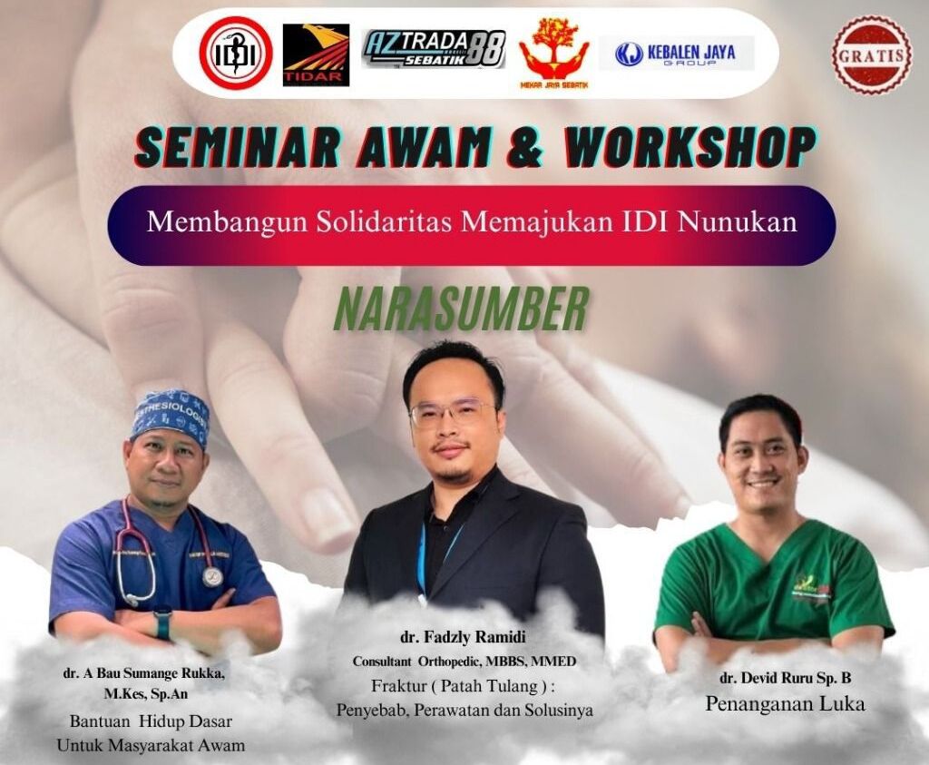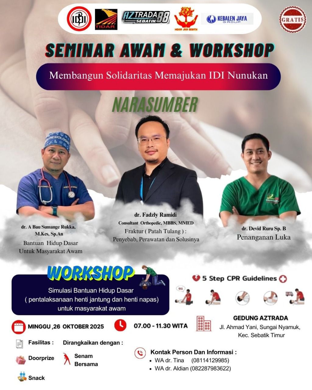 Seminar Awam dan Workshop ini menghadirkan narasumber diantaranya; dr. Andi Bau Sumange Rukka, M.Kes., Sp.An; dr. Fadzly Ramidi serta dr. Devid Ruru, Sp.B., untuk Informasi dan Kontak Person dapat menghubungi dr. Tina (WA 08114129985) dan dr. Aldian (082287983622) (TN/adv)