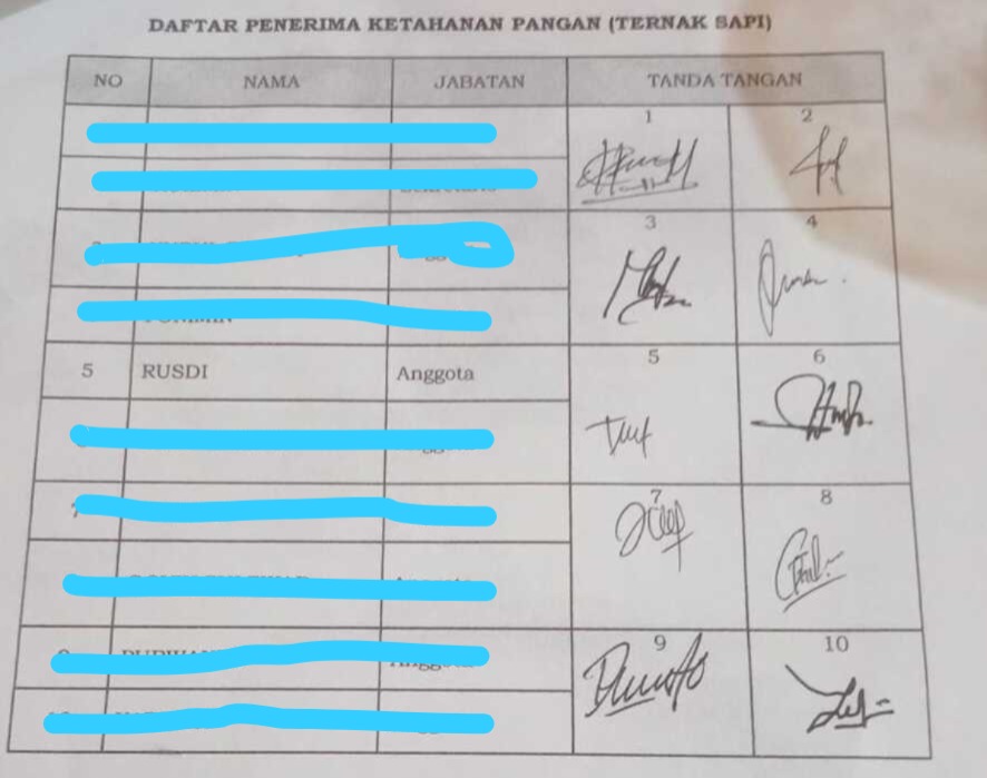 Rusdy mengatakan kepada media ini, Senin siang (10/11/2025), bahwa ia tidak pernah menandatangani daftar penerima bantuan tersebut, baik untuk penerimaan sapi maupun uang tunai, namun namanya tercantum dan diduga ada tanda tangan yang menyerupai miliknya. Menurutnya, tanda tangan yang tercantum di daftar tersebut sangat berbeda dengan tanda tangan yang tertera di KTP maupun di SIM miliknya.