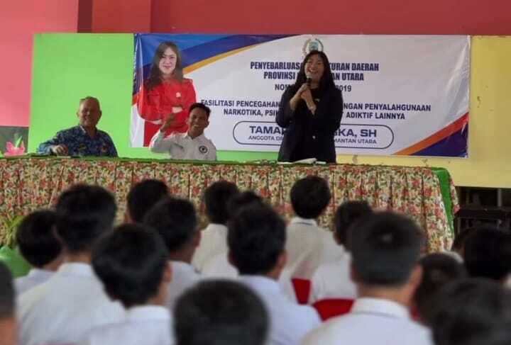 TERASNKRI.COM | NUNUKAN, KALTARA — DPRD Kalimantan Utara terus menggalakkan upaya pencegahan penyalahgunaan narkoba di kalangan pelajar. Ketua Komisi IV DPRD Kaltara, Tamara Moriska, turun langsung ke sejumlah satuan pendidikan di Kabupaten Nunukan untuk menyosialisasikan Perda Nomor 4 Tahun 2019 tentang Fasilitasi Pencegahan dan Penanggulangan Narkotika, Psikotropika, dan Zat Adiktif lainnya.
