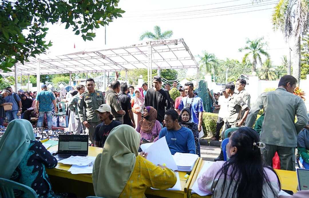 Sejak pagi, ratusan warga telah memadati halaman rumah jabatan sambil membawa KTP dan Kartu Keluarga sebagai syarat pengambilan bantuan. Mereka merupakan penerima manfaat yang telah terdata oleh Dinas Sosial, Pemberdayaan Perempuan dan Perlindungan Anak (DSP3A).