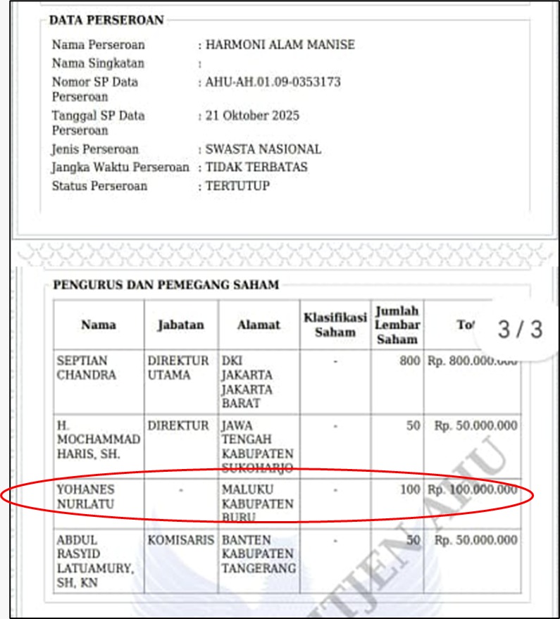 Hasil penelusuran dari berbagai sumber mengungkap motif di balik arogansi Yohanes. Ia diduga kuat menjabat sebagai Komisaris di PT HAM, perusahaan asing yang beroperasi di wilayah tersebut. Publik menilai Yohanes telah melakukan pengawalan di balik layar sejak Januari 2026 untuk mendukung aktivitas ilegal perusahaan asing tersebut, sembari menentang kebijakan Kementerian ESDM dan Pemda Buru.