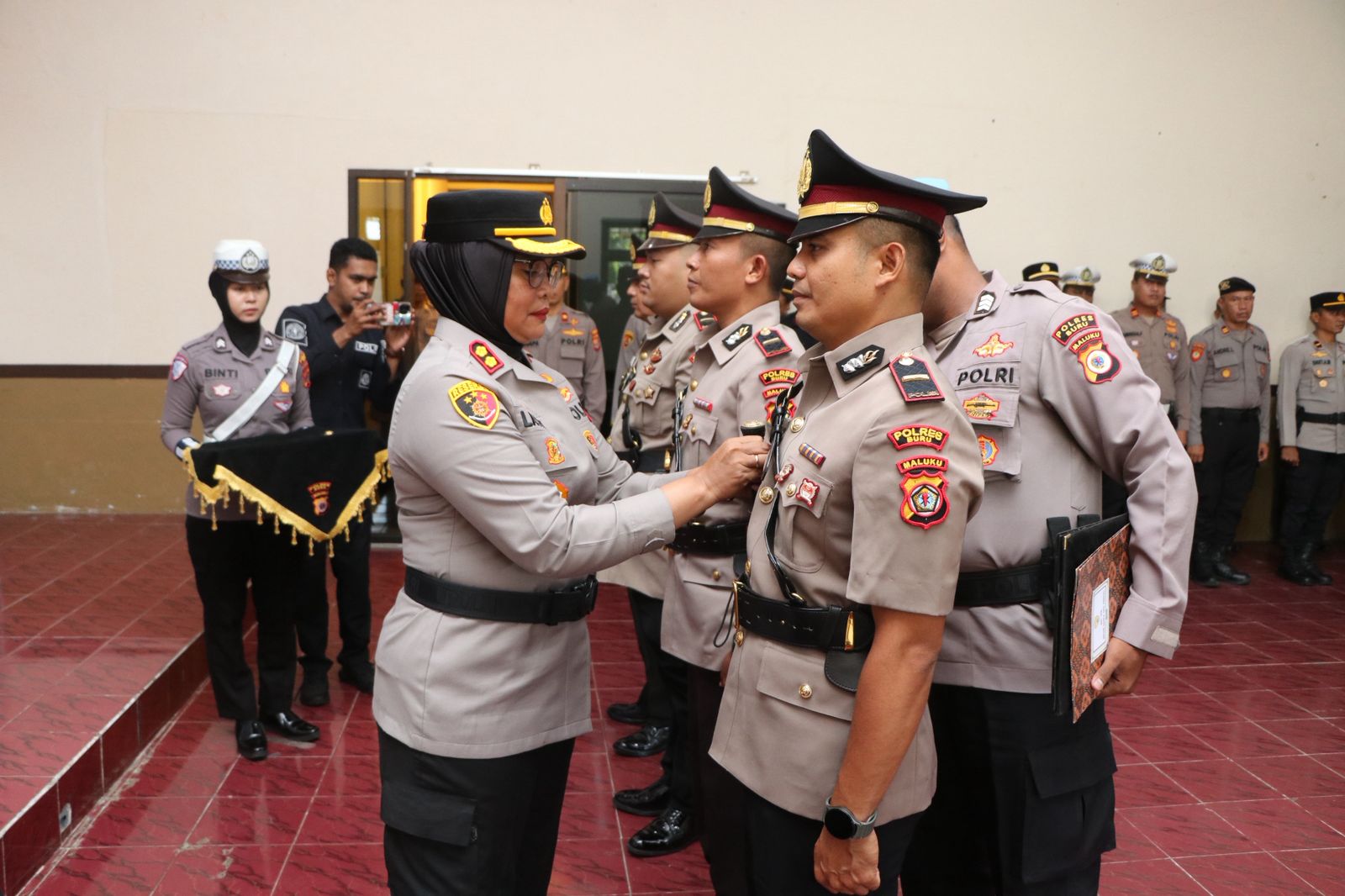 Kegiatan ini turut dihadiri oleh Wakapolres Buru, para pejabat utama Polres, para Kapolsek, personel Polres Buru, Bhayangkari, hingga unsur Brimob, yang bersama-sama menyaksikan momentum penting dalam pembinaan karier personel Polri.