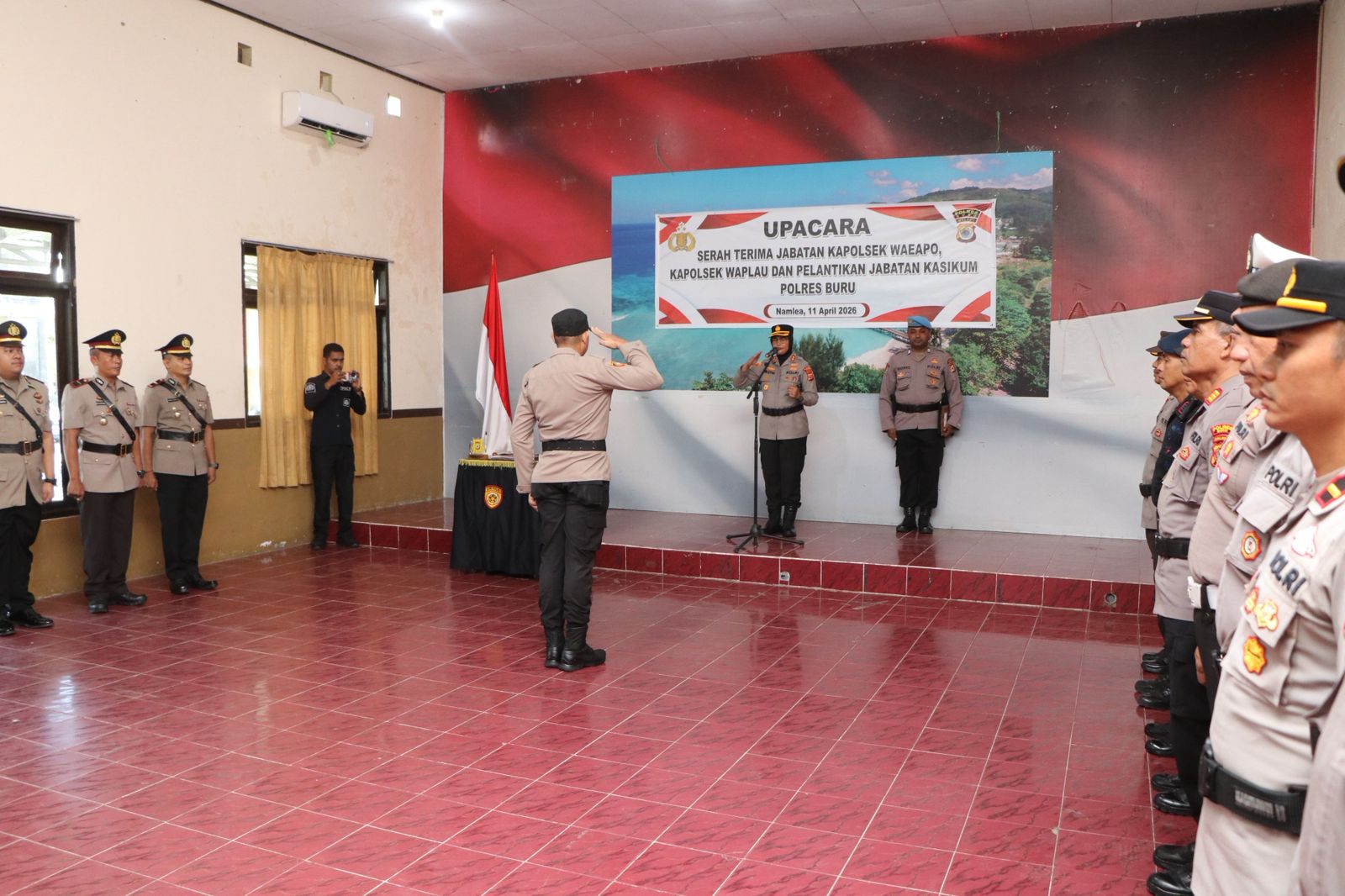 Dalam upacara tersebut dilaksanakan serah terima jabatan Kapolsek Waeapo dan Kapolsek Waplau, serta pelantikan jabatan Kasikum Polres Buru. Prosesi berlangsung tertib, mulai dari pembacaan keputusan Kapolda Maluku, penyematan tanda jabatan, pengambilan sumpah jabatan, hingga penandatanganan berita acara dan pakta integritas.